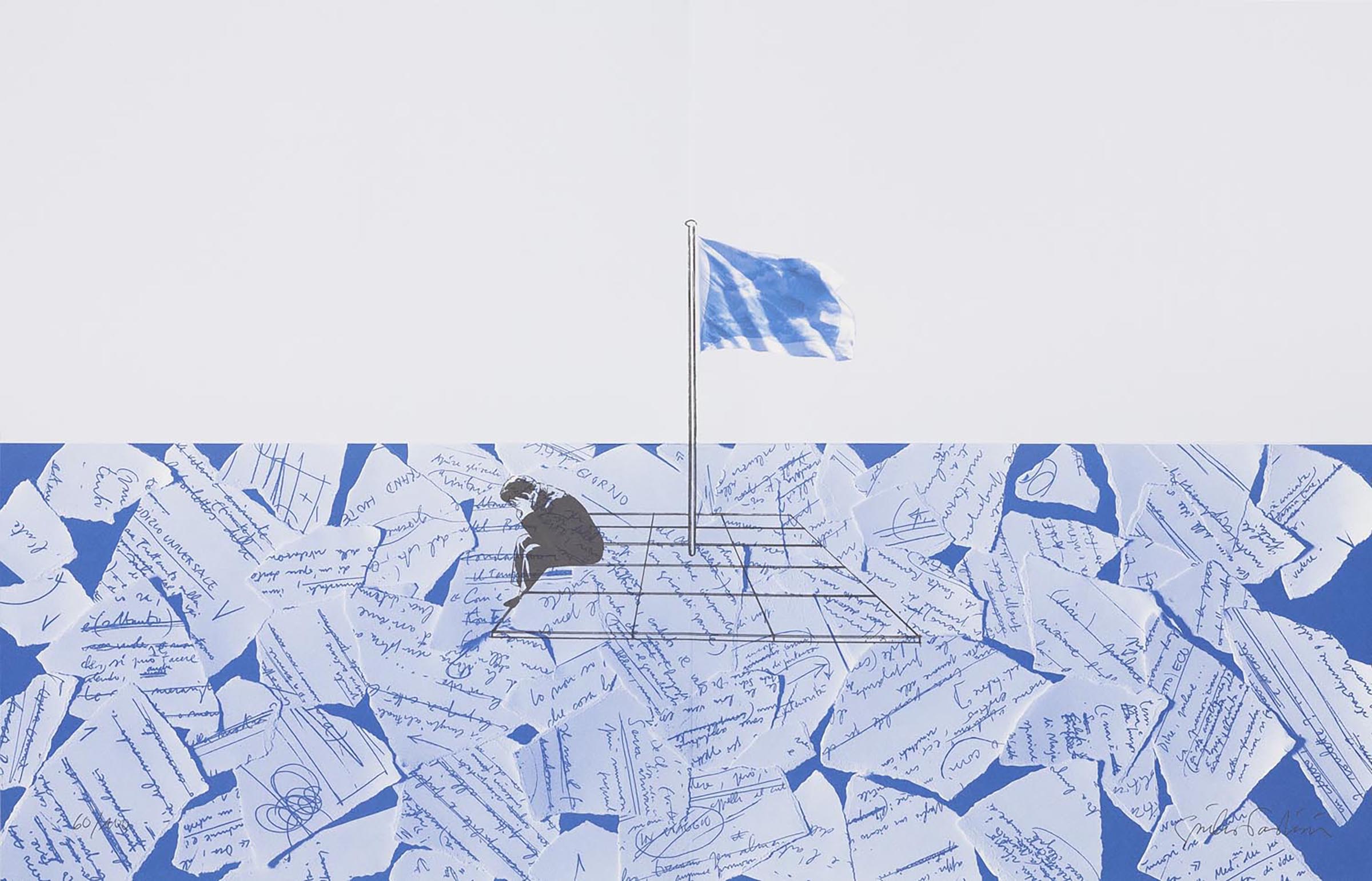 The print conceived for the volume of writings by the artist titled Giro di boa portrays, in the lower half with a blue background, a male figure holding his head in his hands, seated on a raft, outlined in the midst of a sea of torn fragments of autograph notes, in a blue tone, simulating the ripples of the waves. At the centre of the raft, in the area corresponding to the central fold in the plate, is a pole with a flag representing a portion of the sky1 that stands out against the white background of the upper half of the print.