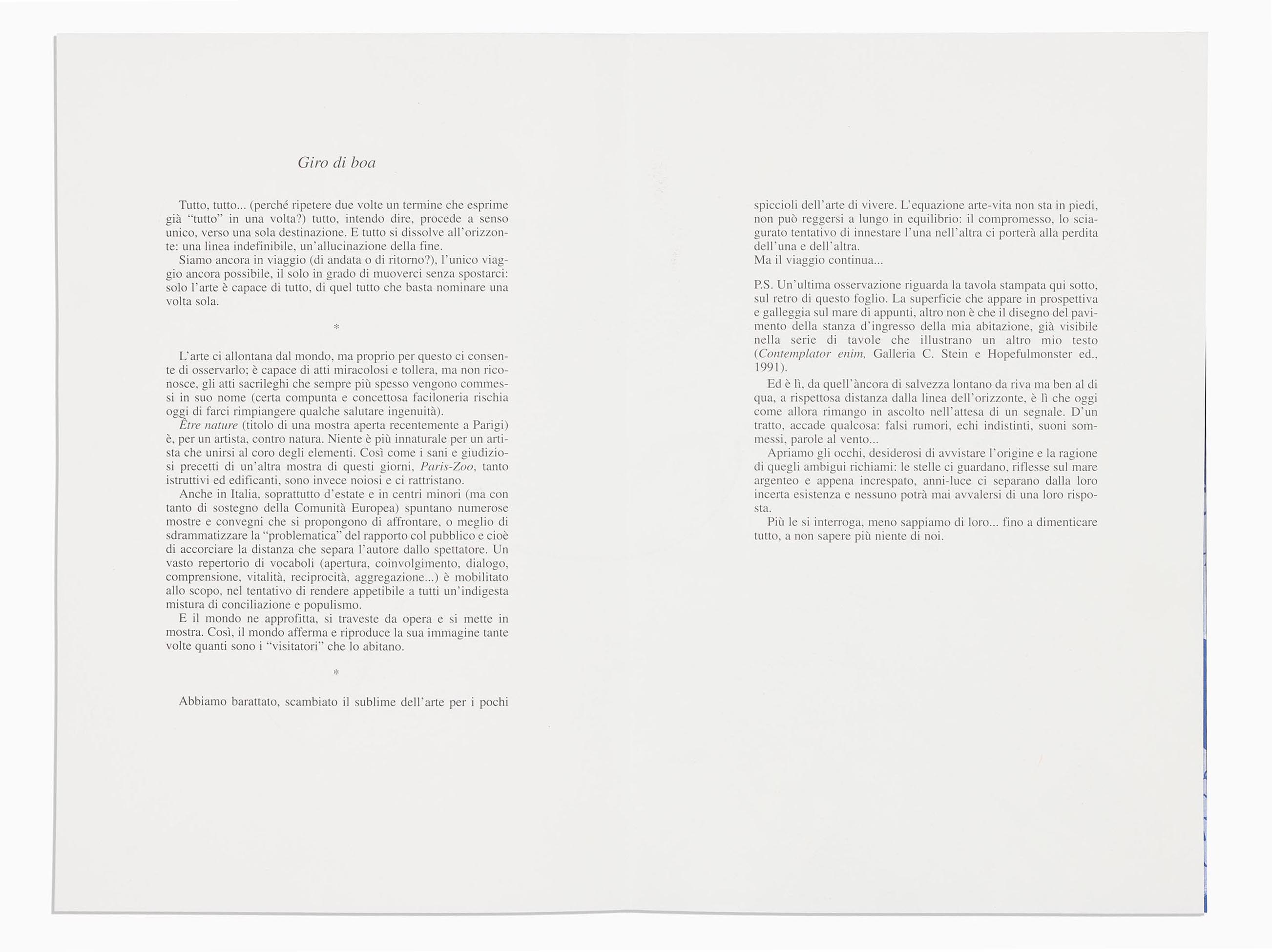 Just as the book Giro di boa completes the trilogy of writings by the artist that began with Lezione di pittura (1995) and continued with Black out (1996), so the plate particularly refers to Lezione di pittura, via the motifs of the figure absorbed in thought and of the floor-pavement marked by a perspectival grid (here in the role of a raft). And like the previous books, Giro di boa as well presents, on the internal side of the jacket, the drawing of a setting seen in perspective, in this case impressed in white on dark blue and without any accessory elements.