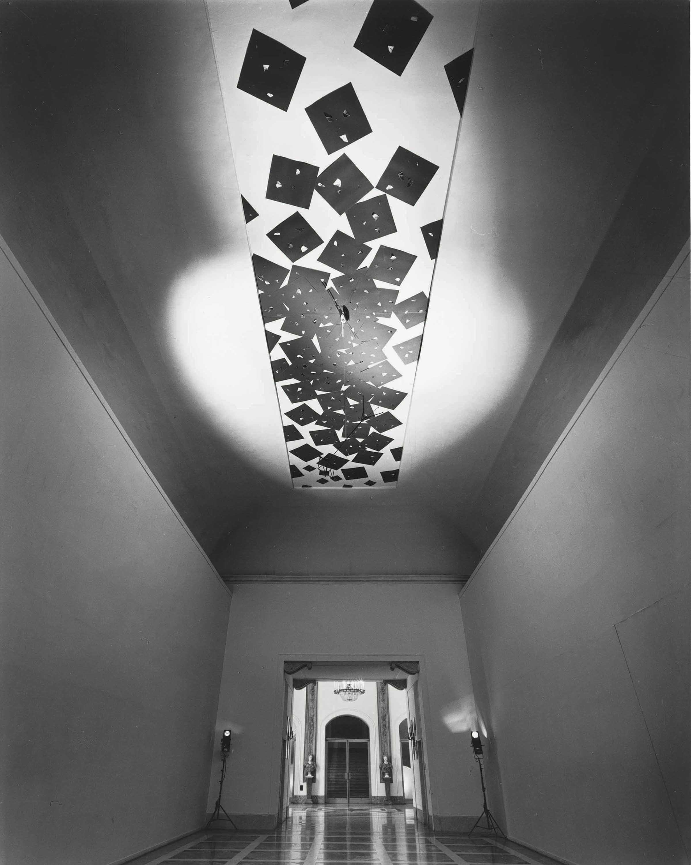 A multitude of bright blue pieces of cardstock, studded with golden clips that hold small fragments of reproductions of stellar cards and of previous works by the artist, are scattered across the ceiling to simulate the view of the firmament. Towards the outer part of the visual field they gradually thin out, and at the two ends of the area they are reduced to a format that complies with the perspectival view; the cards along the edges are trimmed as well, in order to suggest a hypothetical continuum. At the centre, a nylon thread fastened to the ceiling between a black men's shoe and a white ballerina's scarf – arranged so that they point in opposite directions – holds a music stand hanging in the void.