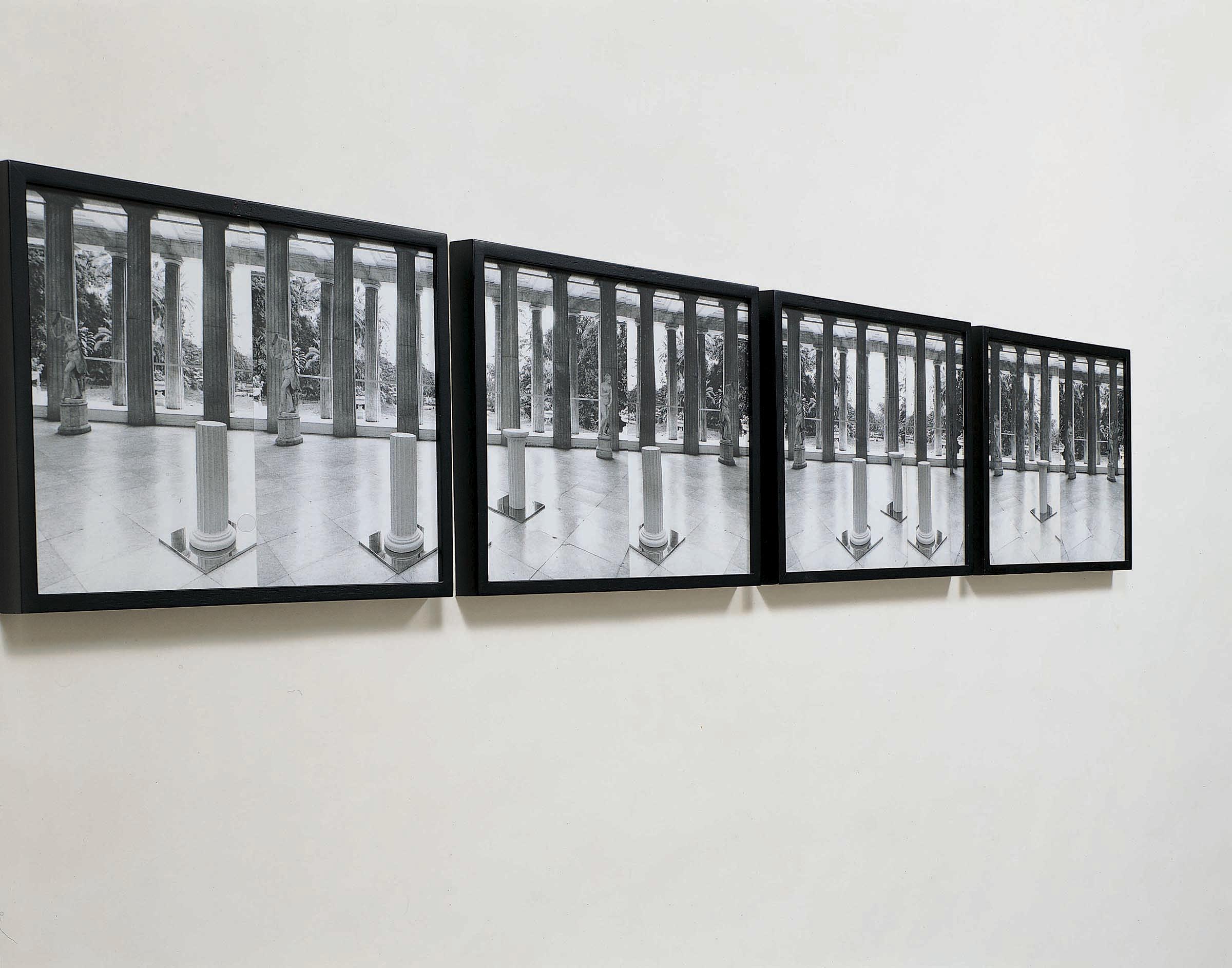 A uniform grid outlined over the entire extent of the wall serves as a chessboard that contains twenty-two photographs in random order. The pictures are all the same but each time they bear a different collage. The repeated image reproduces the Sala Veranda of Villa Pignatelli in Naples, dominated by a Neoclassical colonnade.1 From one element to another this "observatory" becomes a theatre of the appearances and disappearances of the semi-columns – one of which upside down, the other right side up – in Caleidoscopio, 1976 (GPO-0323),1 dislocated like game pieces in a puzzle in gradually different points of the flooring's modular pattern, developed along oblique axes with respect to the monumental columns, generating a kaleidoscopic geometry of vanishing points, doubles, and reflections.