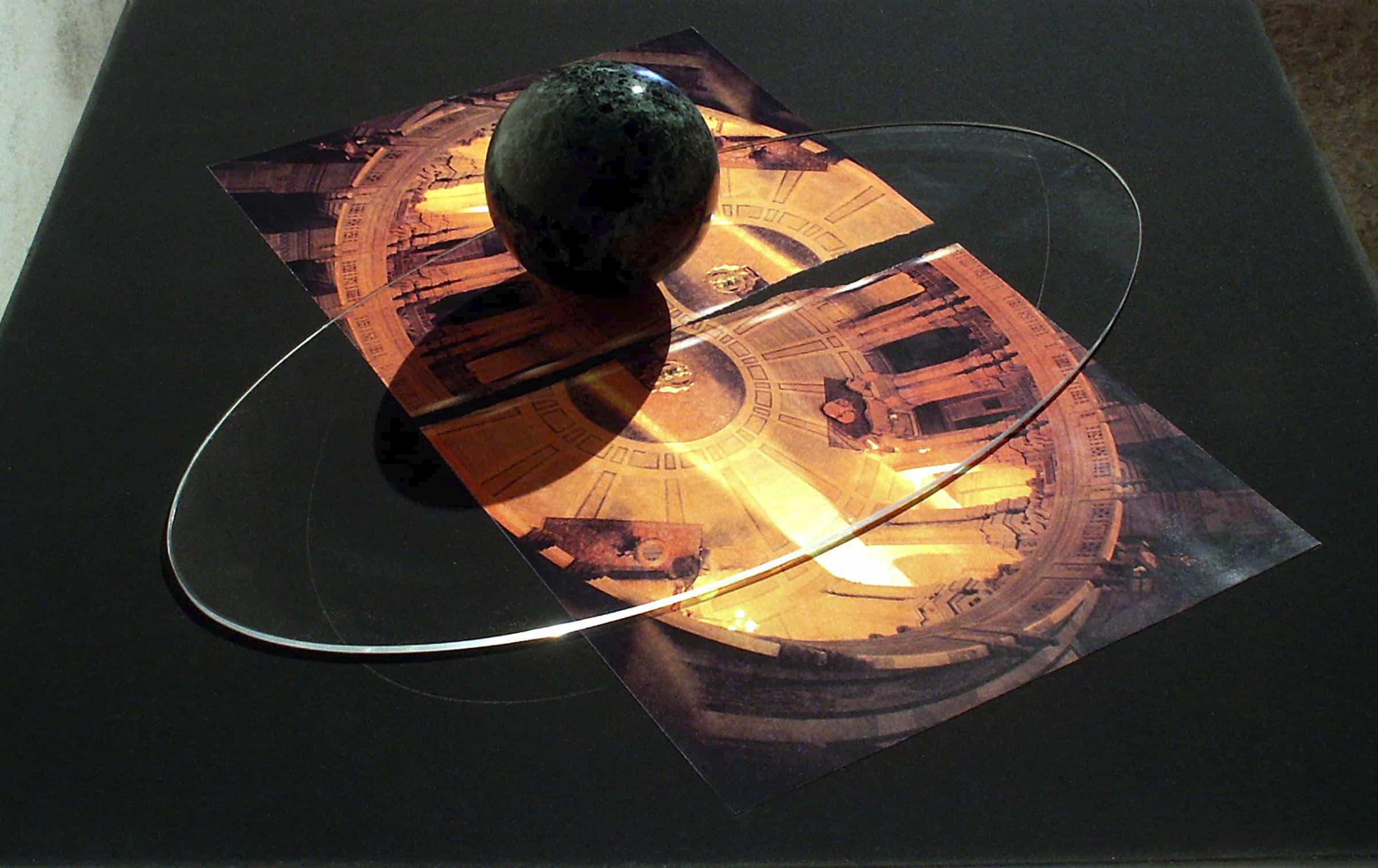 An elliptical plexiglas sheet with a sphere of veined black marble at its centre is placed on a larger square sheet so that it is slightly staggered in relation to the elliptical space reproduced in the colour image, torn in half, and held down on a black sheet of paper under the plexiglas sheet (the two half images are inverted with respect to each other). The sphere-globe serves as a hinge for the rotatory dynamic suggested by the whole.