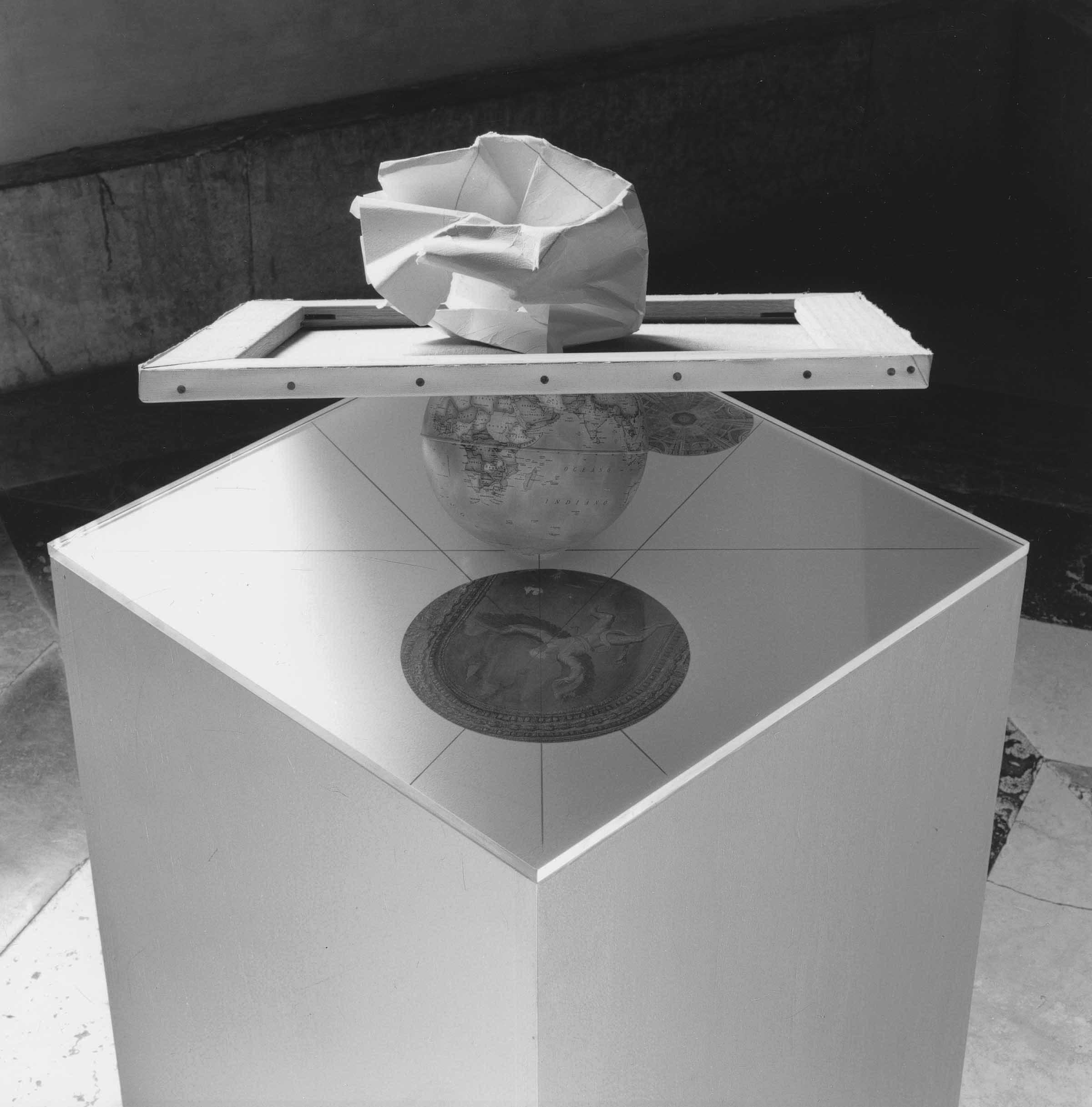 Primed canvas, globe, crumpled drawing, collage and pencil on paper, plexiglas sheet, white plinth