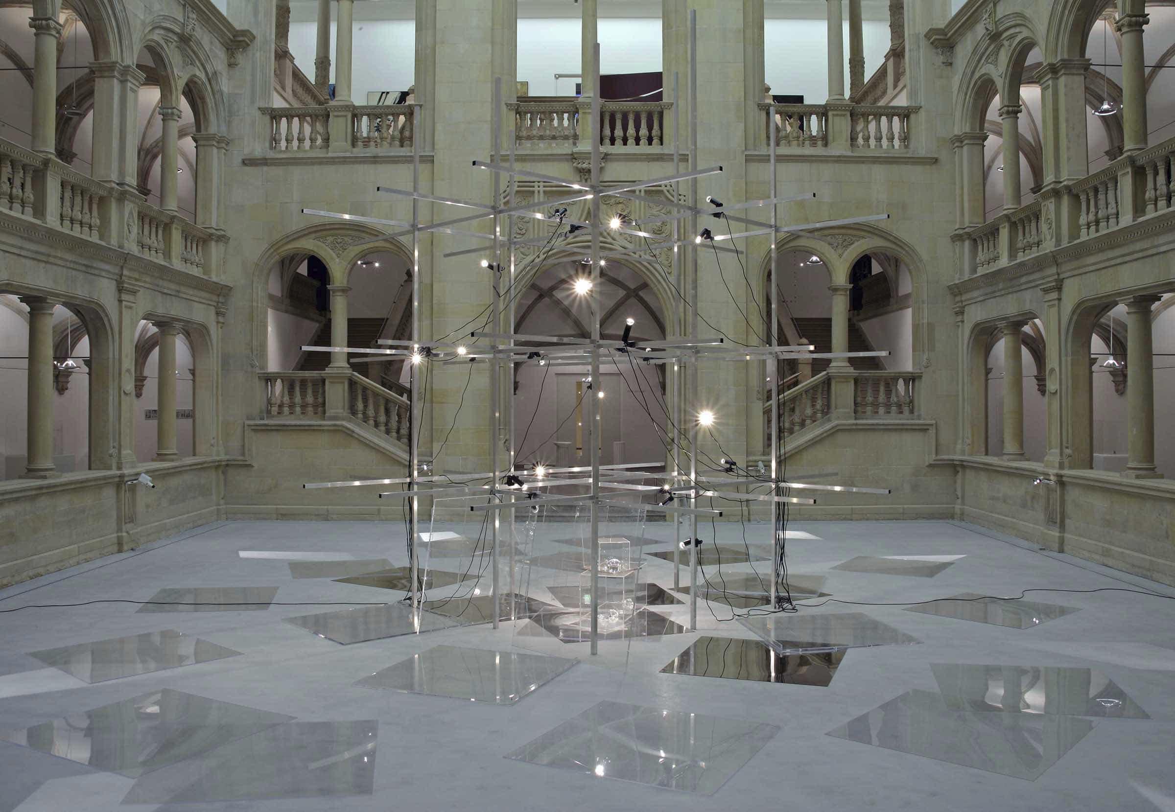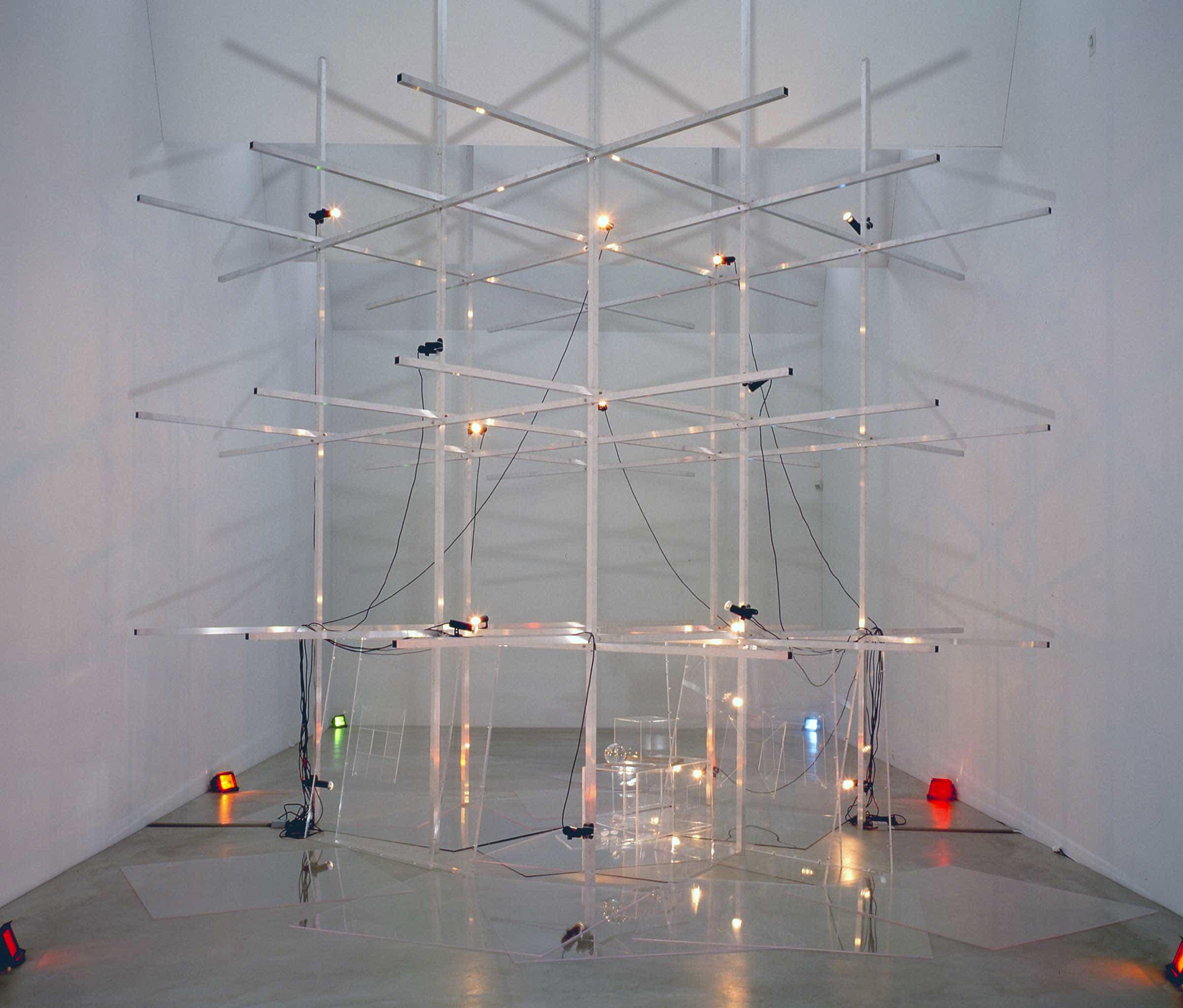 A large orthogonal framework made up of steel profiles features twelve spotlights and is lit by nine coloured halogen lamps, arranged on the ground, at equidistant intervals, along the sides of the room. Several plexiglas sheets are propped up against this framework. The sheets are carved with the drawing of a room in which an empty cube is located on a plinth. Other transparent or reflecting sheets are scattered on the ground. On one of these sheets is a plexiglas cube, topped by several translucid objects: a small empty case, a fragment of Murano glass, an hourglass containing white sand, and a crystal ball, along with several small plexiglas sheets featuring a carved drawing.