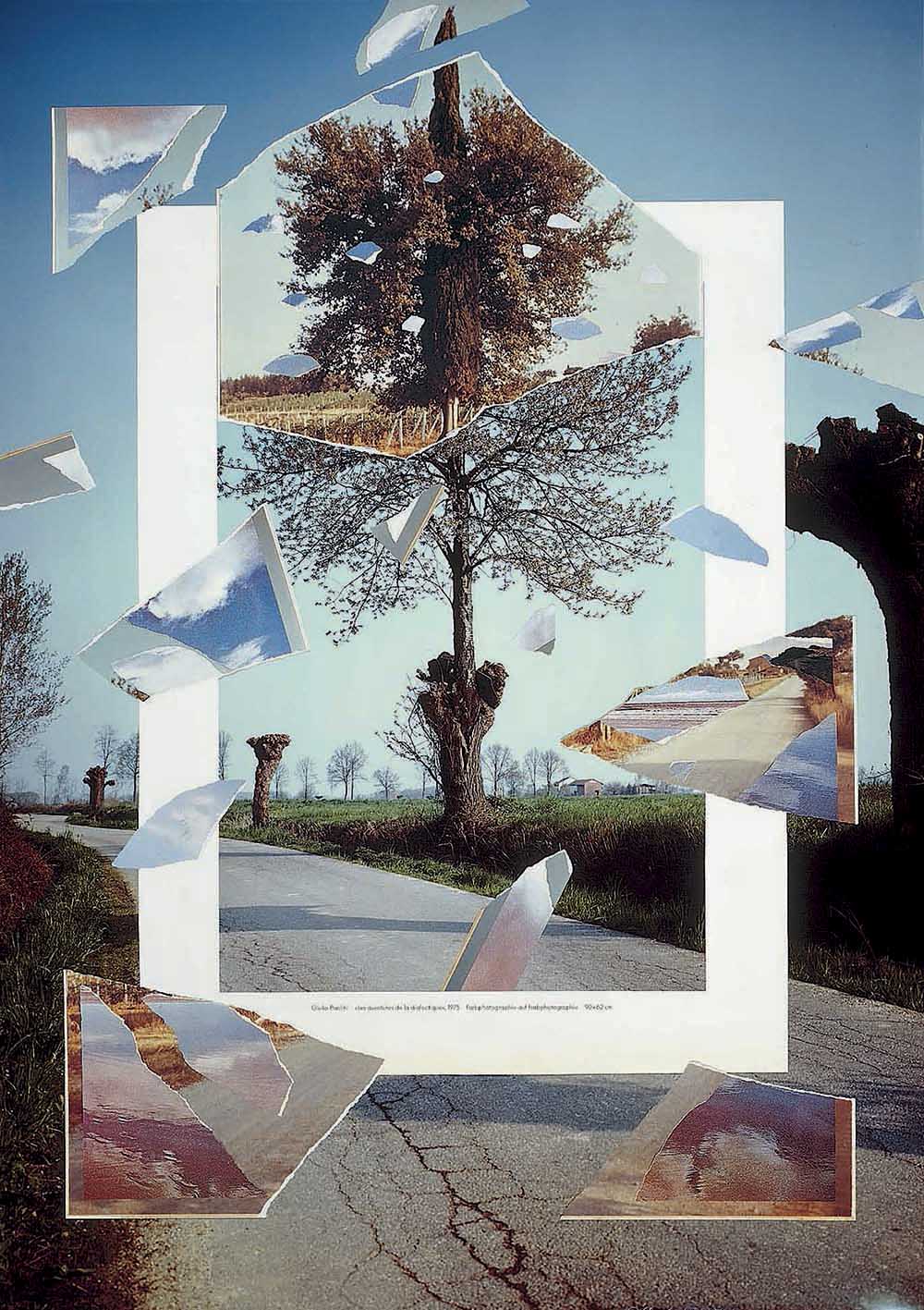 La veduta di una strada fiancheggiata da alcuni alberi presenta al centro un albero che cresce all’interno di un altro tronco. In primo piano, una riproduzione della prima versione di Les aventures de la dialectique – un’opera su carta realizzata nel 1975 (GPC-0372) – è lacerata in frammenti, in modo però da lasciare intatto, alla maniera di un passe-partout, il margine bianco della pagina a stampa, recante in basso al centro la didascalia dell’opera in lingua tedesca. Il frammento principale, raffigurante un cipresso nato dentro una quercia, è innestato sulla coppia di alberi al centro dell’immagine di sfondo, in modo da raddoppiare l’innesto vegetale, posto in risalto dall’inquadratura bianca.