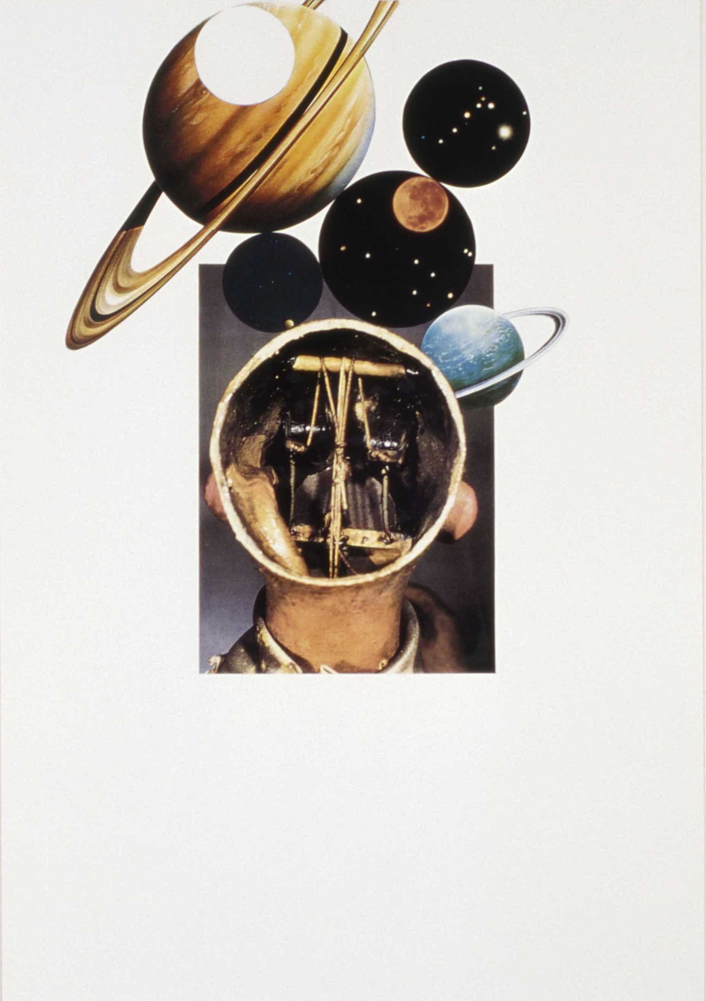 La singolare immagine al centro del foglio riproduce un automa settecentesco, la cui testa è sezionata per mostrarne il meccanismo interno. Nella parte superiore del foglio, tutt’intorno alla testa, sono applicate le riproduzioni di alcuni pianeti.