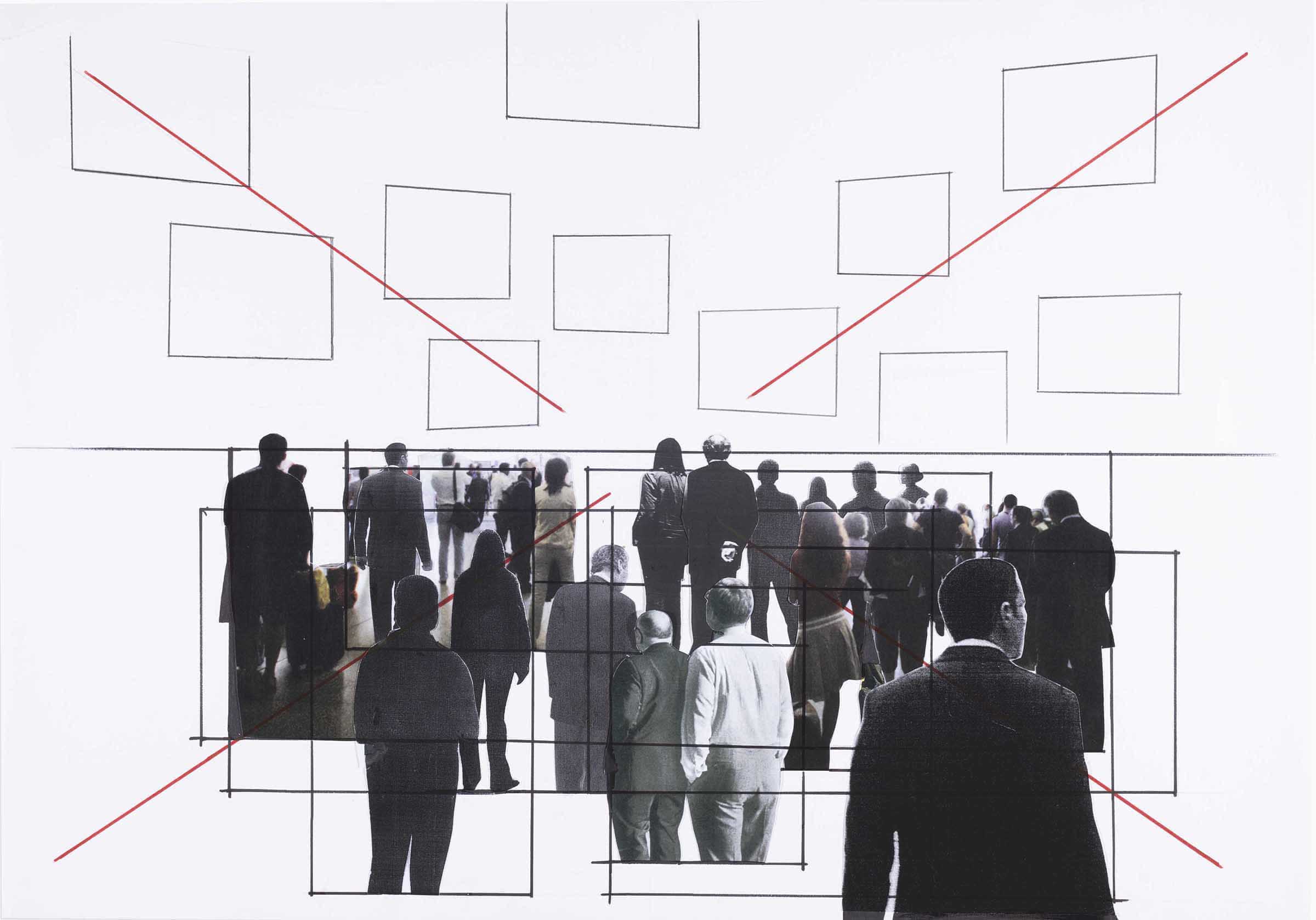 Matita, inchiostro rosso, inchiostro nero e collage su carta