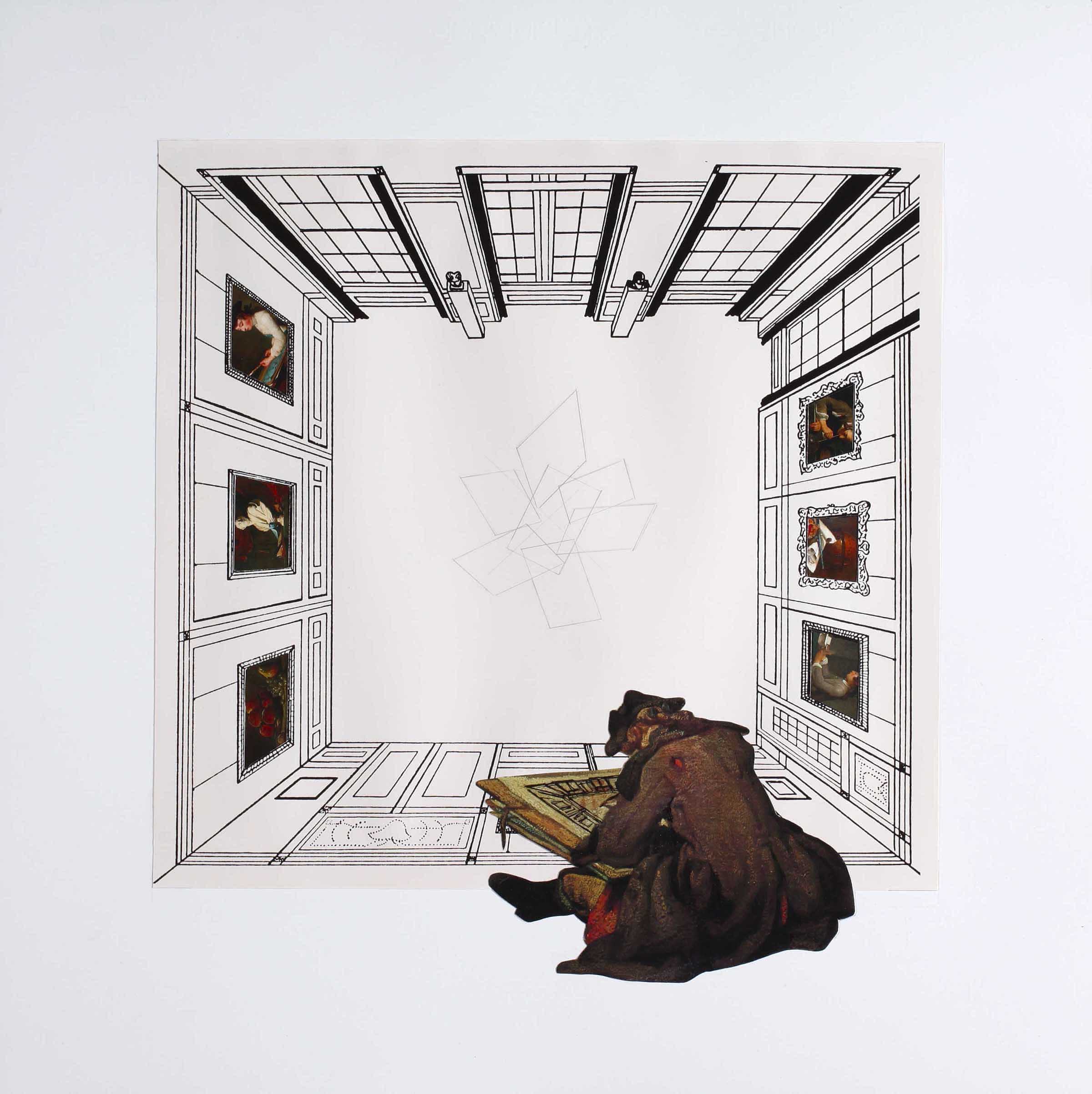 Il personaggio maschile in primo piano, raffigurato di spalle e intento a disegnare – ripreso da Le jeune dessinateur (1737 ca.) di Jean-Baptiste-Siméon Chardin – è seduto sulla soglia di una stanza vista dall’alto1. Le pareti dell’ambiente ospitano sette quadri: sei riproducono dipinti dello stesso Chardin, mentre il settimo è nascosto dalla cartella che il disegnatore tiene davanti a sé. In corrispondenza dello spazio vuoto della stanza sono delineati a matita sette riquadri – il formato trapezoidale li inscrive nella prospettiva dall’alto – disposti in modo diverso in ciascun esemplare della tiratura.