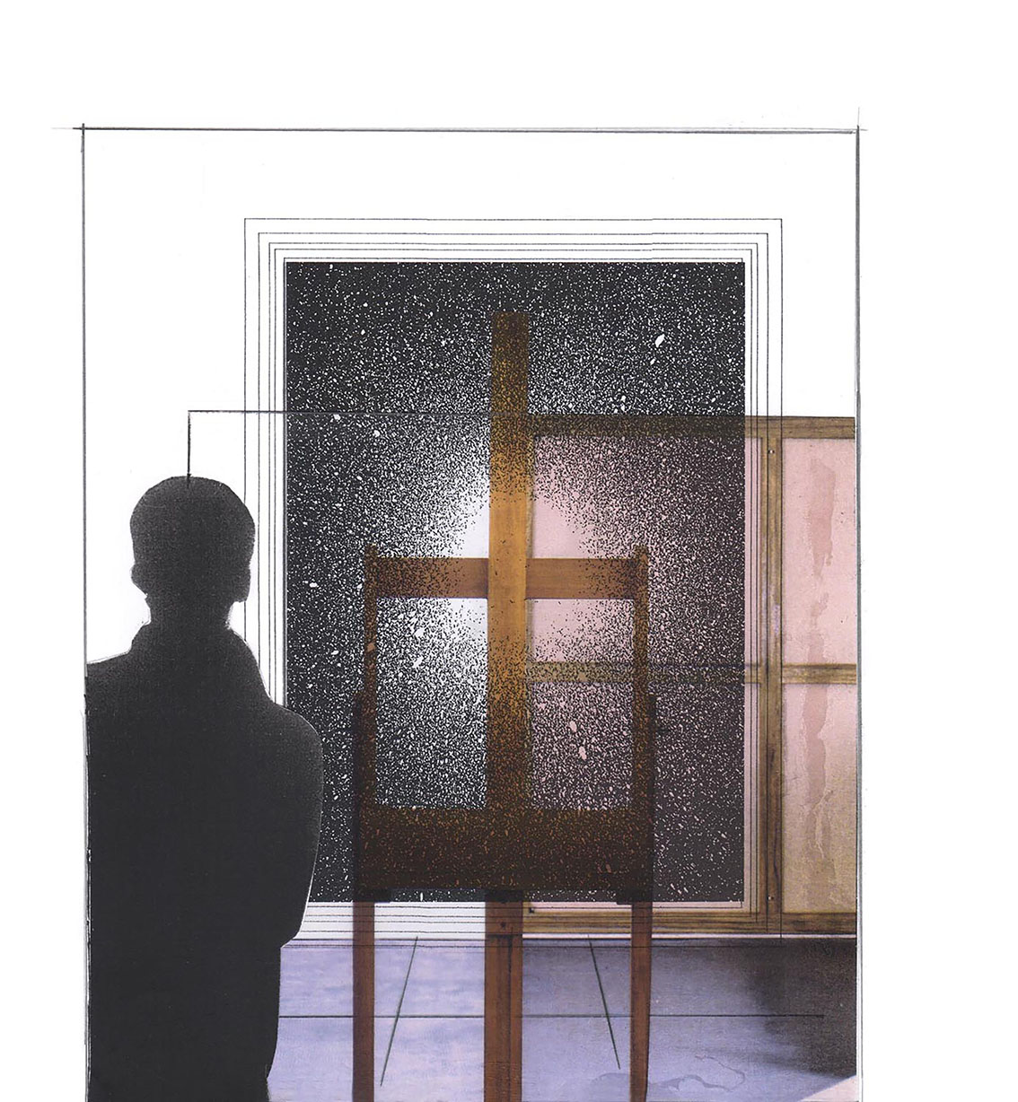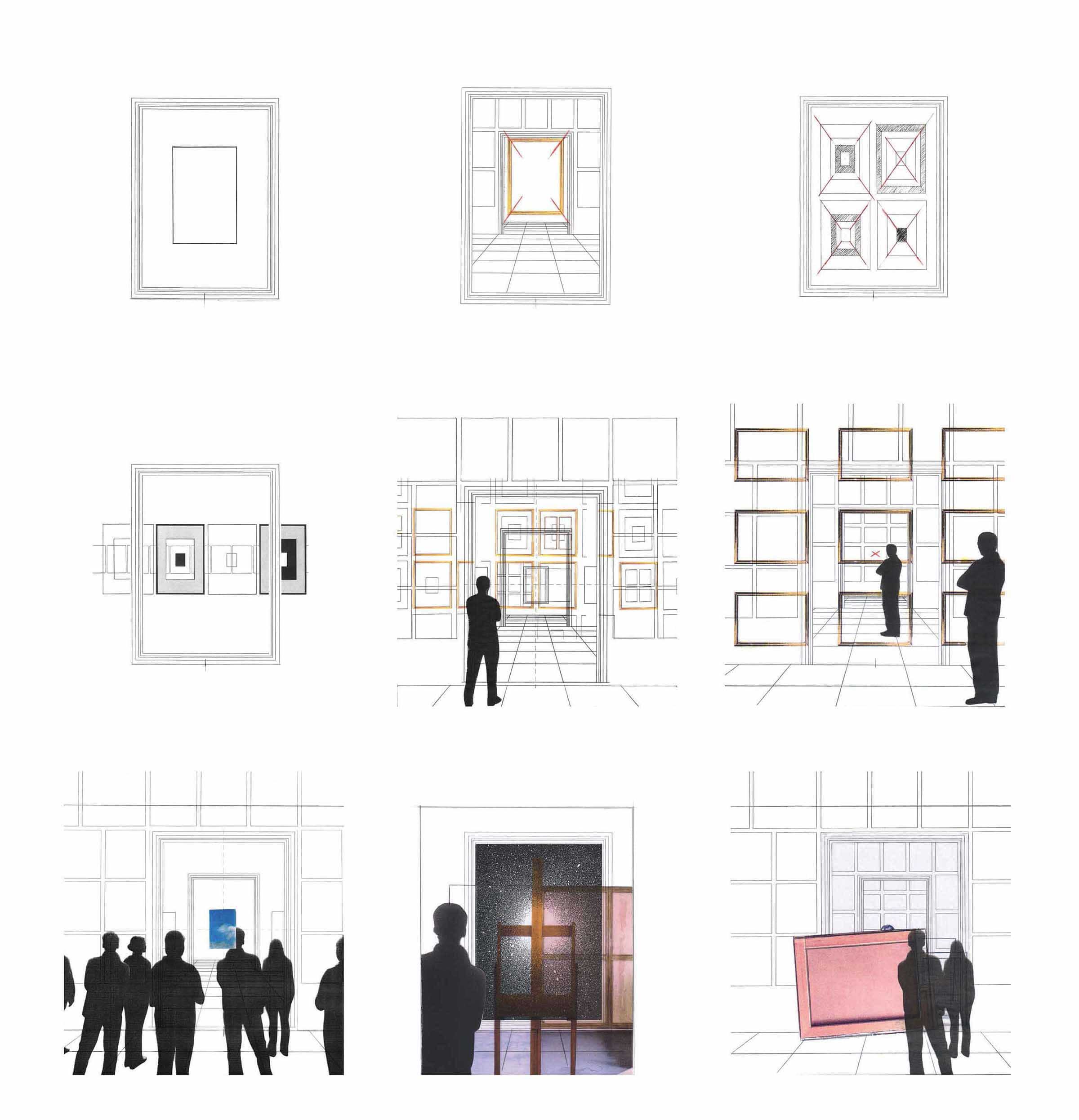 I nove fogli propongono una serie di inquadrature, che di volta in volta si fanno più complesse, moltiplicandosi come in un gioco combinatorio. La cornice iniziale che inscrive un riquadro singolo diventa soglia di una stanza vista in prospettiva, poi di un’infilata di stanze con fitte quadrerie. Dal quinto elemento in poi, si aggiungono alcuni spettatori, visti di spalle e rivolti verso il punto di fuga della rappresentazione prospettica (un quadro cieco, uno scorcio di cielo, un’immagine siderale).