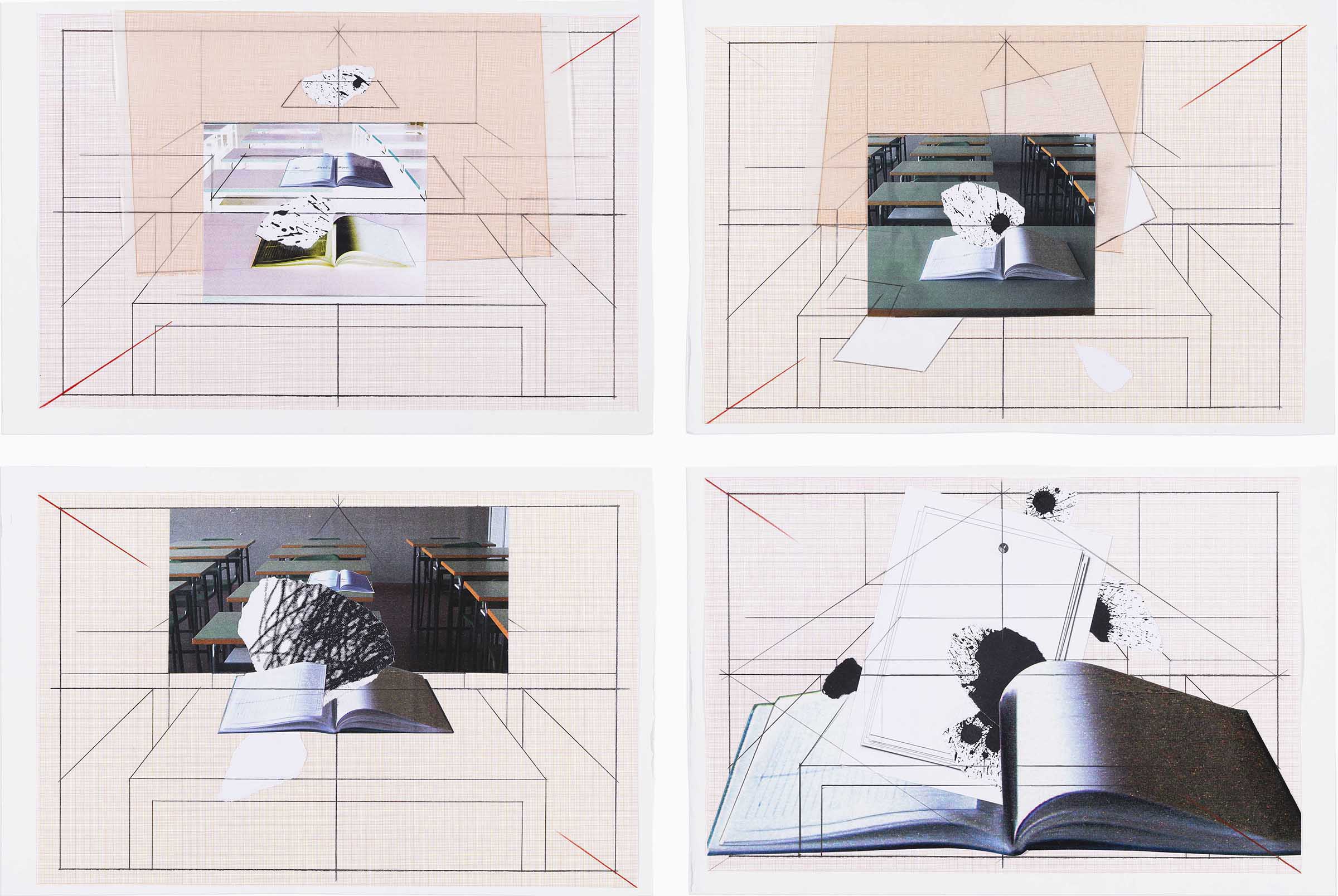 Matita, matita rossa, riproduzione su carta da lucido e collage su carta millimetrata