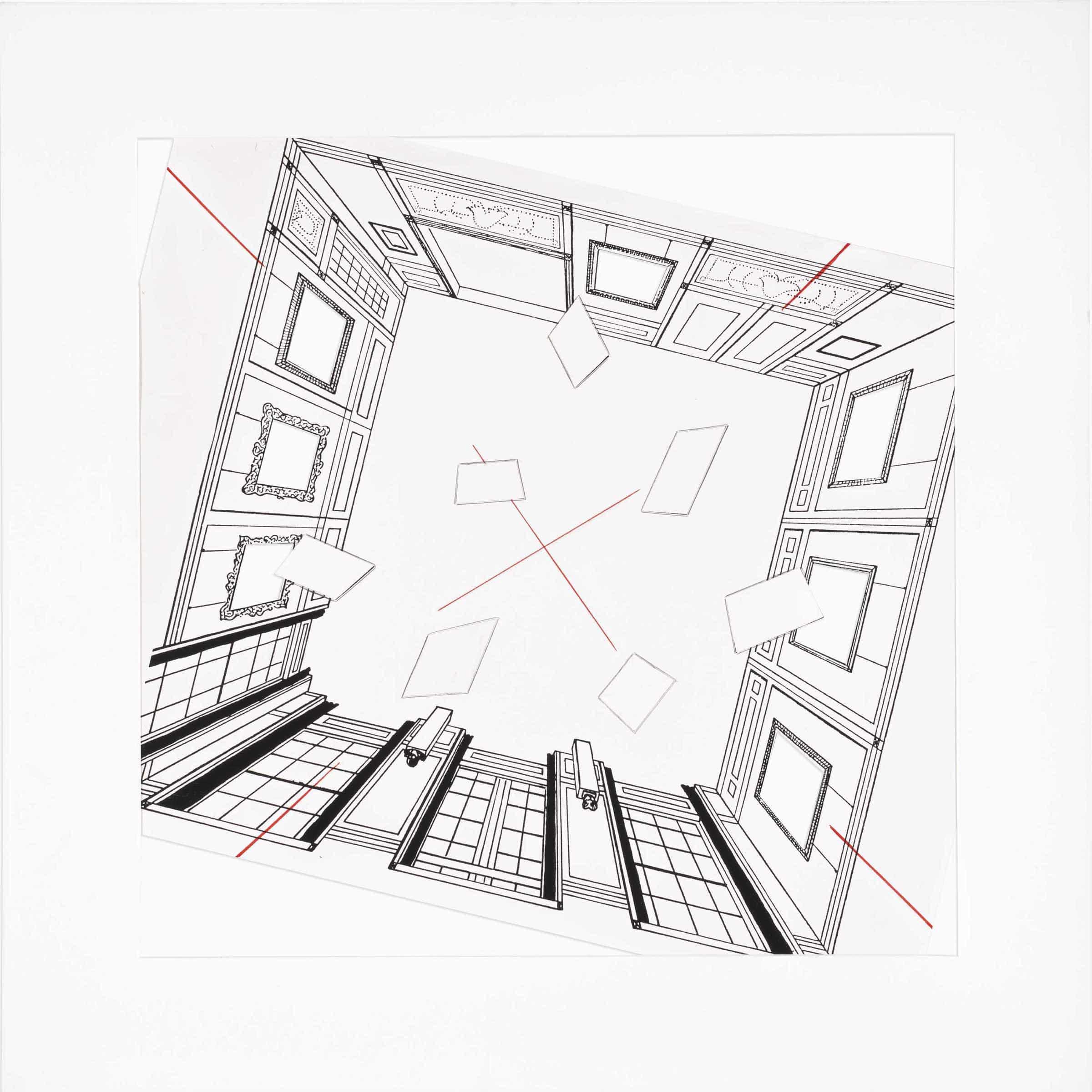 La rappresentazione di un ambiente espositivo a pianta quadrata, visto dall’alto e sfalsato rispetto ai lati del foglio, è animata da sette quadrangoli, delineati a matita, in caduta libera verso il centro del foglio segnato dall'incrocio delle diagonali rosse. I sette elementi di formato trapezoidale, inscritti nella prospettiva centrale, riprendono i sette quadri sospesi alle pareti dell'ambiente espositivo, alludendo agli innumerevoli volti possibili di un quadro, così come alle infinite possibilità del divenire di un'immagine.