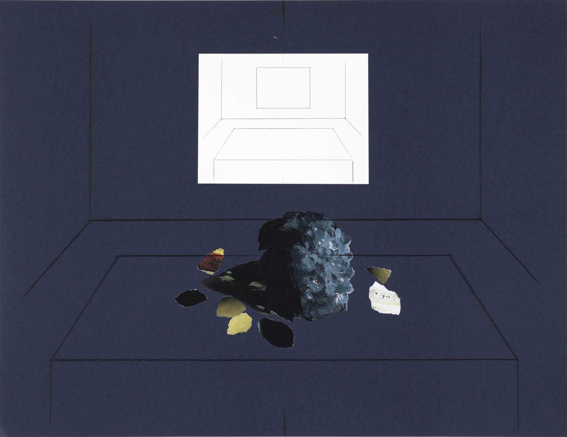 Il disegno a matita su carta blu propone un ambiente in prospettiva, con un tavolo al centro sul quale è posato un mazzo di viole e alcuni frammenti cartacei a guisa di foglie, ripresi da un dipinto di Édouard Manet. Al centro, sulla parete di fondo, un riquadro bianco presenta il medesimo spazio prospettico tracciato a matita in scala ridotta.
