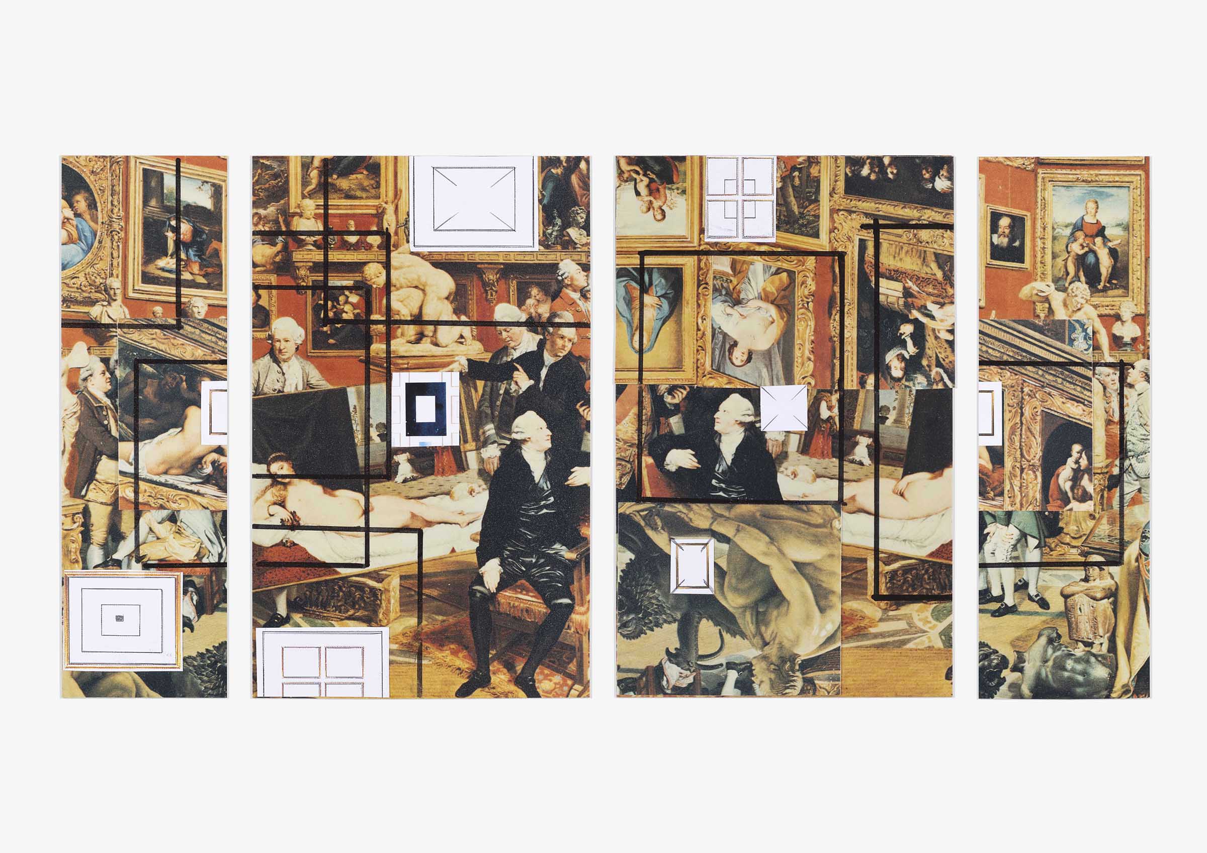 La riproduzione del dipinto The Tribuna of the Uffizi (1772-77) di Johann Zoffany è scomposta in quattro parti, accostate a brevi intervalli e in modo incongruo (la prima e l’ultima sono tagliate, a suggerire una continuità potenzialmente illimitata). All’interno delle singole parti l’integrità dell’immagine è interrotta da particolari dello stesso dipinto inseriti in modo incoerente oppure dal montaggio discontinuo di dettagli, talora capovolti. Alle immagini del dipinto si sovrappongono alcune riproduzioni di cornici dorate e un disegno in nero di riquadri lineari che suggeriscono altri quadri, ancora senza volto.