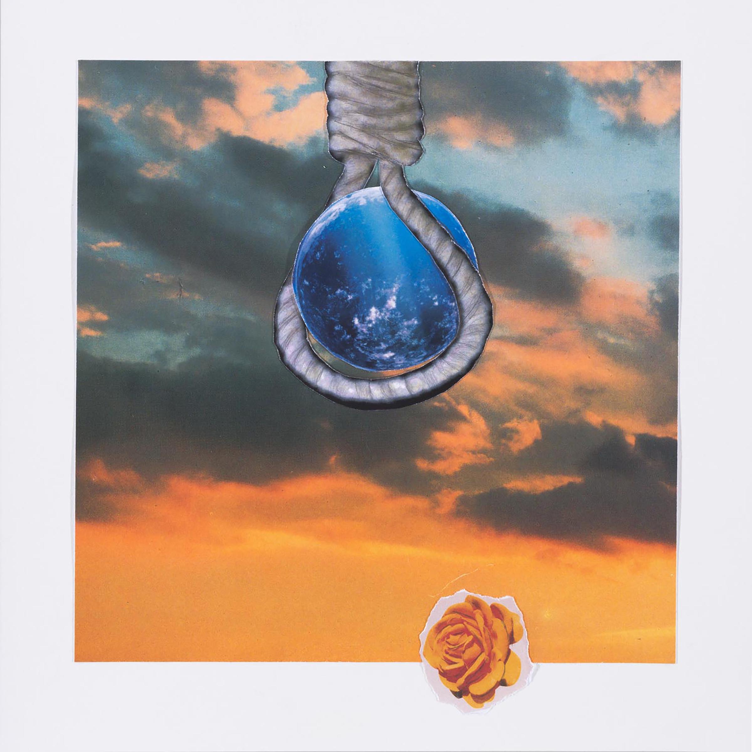 Sullo sfondo di un cielo in tonalità arancio-azzurre, l’occhiello di un nodo scorsoio trattiene l’immagine del globo terrestre, mentre in basso un ritaglio lacerato nella riproduzione del cielo accoglie la fotografia di una rosa gialla.
