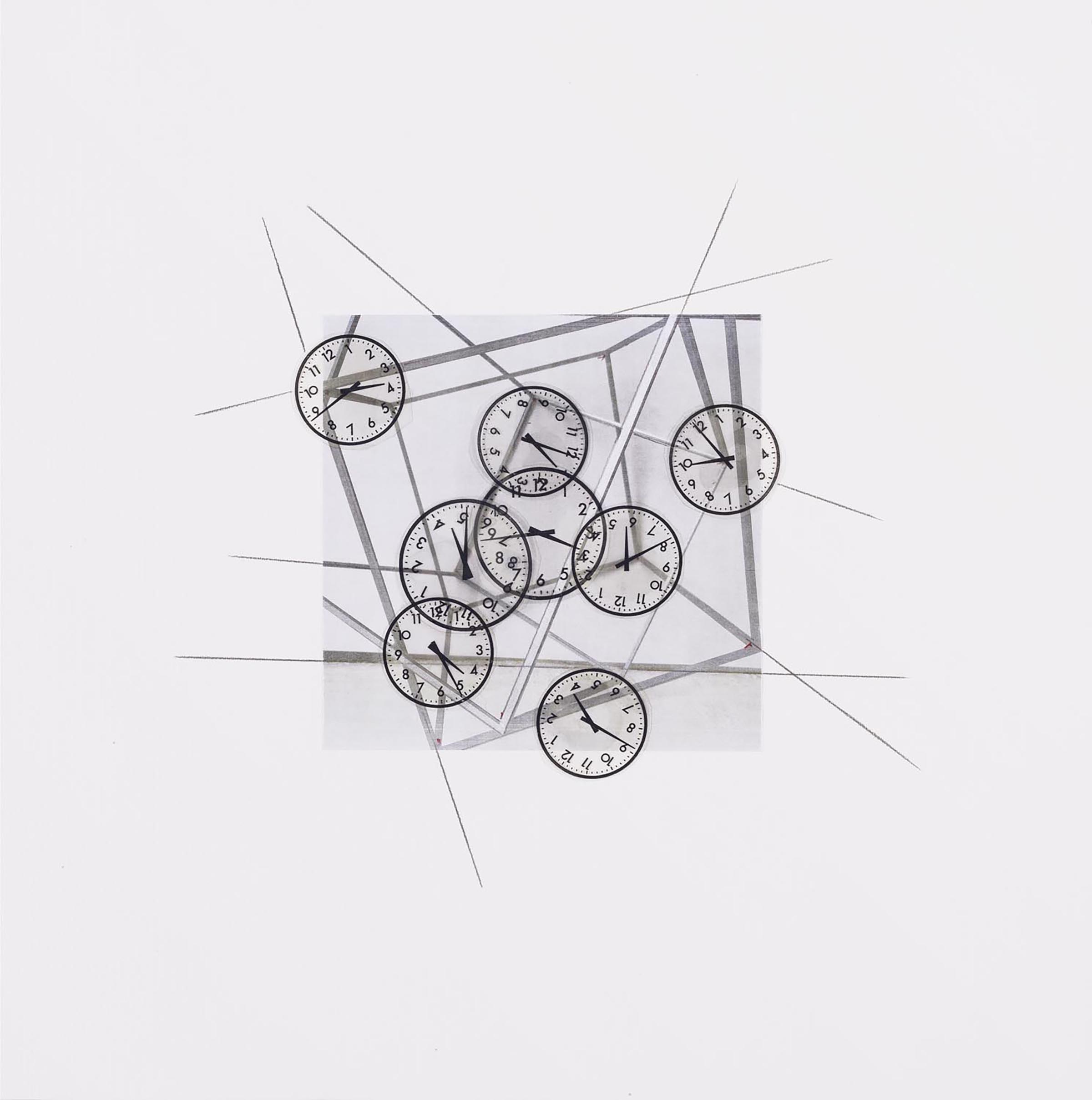 L’intricato incrocio di assi lineari e angoli ortogonali, combinato con la dinamica rotatoria degli orologi, l’ambiguità dei piani spaziali e la complicità delle illusioni ottiche genera una situazione percettiva inestricabile, che annulla qualunque punto di riferimento. Gli orologi fra loro incoerenti sospendono il tempo univoco, così come l’incastro di strutture volumetriche mette fuori gioco le coordinate spaziali ordinarie. Dalla logica dei singoli elementi alla labirintica immagine d’insieme, gli artifici della rappresentazione si rendono manifesti in tutta la loro enigmatica peculiarità.