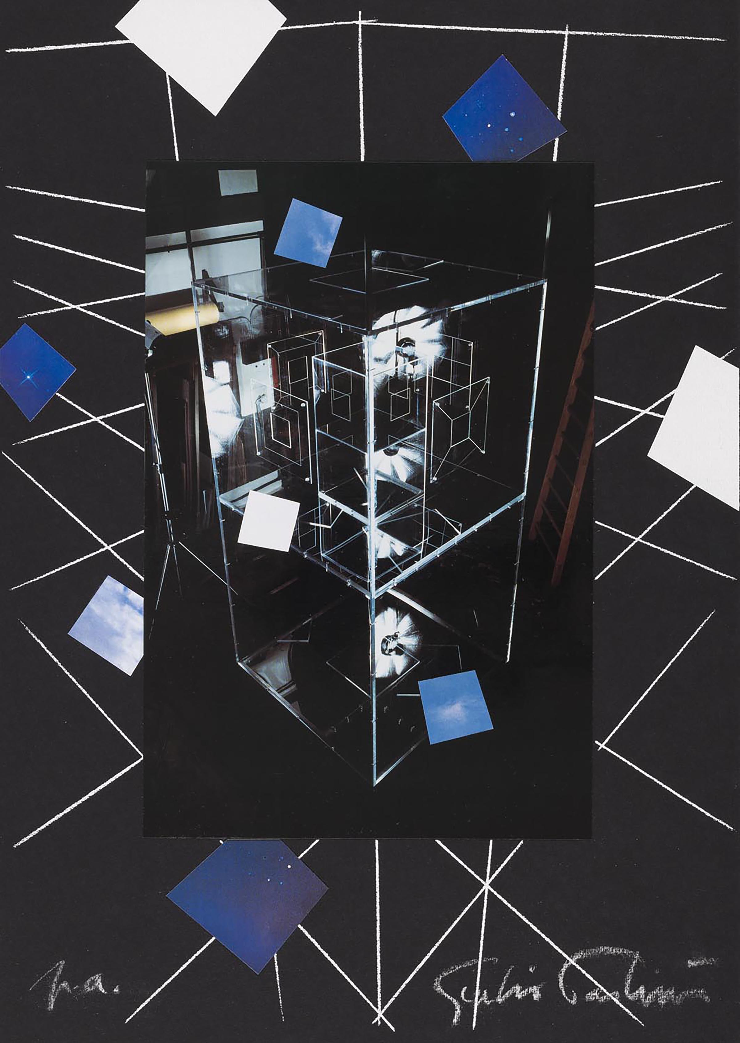 Al centro del foglio di carta nera è applicata un’immagine fotografica che riproduce – in una prospettiva angolare e da un punto di vista soprelevato – l’opera di Paolini intitolata Esposizione universale, 1992 (GPO-0705), nella fase finale della sua produzione, presso la ditta Alpeat, committente dell’edizione. L’opera riprodotta, interamente in plexiglas, è costituita da due cubi sovrapposti: quello inferiore funge da base, quello superiore racchiude altri due cubi sovrapposti, più piccoli, mentre al centro di ciascun lato reca inciso un disegno di quadrati. La fotografia è stata scattata di notte da Paolo Mussat Sartor, da qui la presenza delle lampade che si rispecchiano nel plexiglas della struttura, amplificando il complesso gioco di trasparenze e riflessi. Sullo sfondo nero, un disegno bianco prosegue le linee che definiscono i lati della struttura riprodotta nella fotografia, riprendendone anche l’ambientazione notturna. Sull’assieme sono sparsi nove quadrilateri, deformati in trapezi in conformità alla visione prospettica, che volteggiano nello spazio virtuale come fossero quadrati fuoriusciti dalla struttura di plexiglas; tre sono bianchi, gli altri riproducono particolari di cielo notturno o diurno.