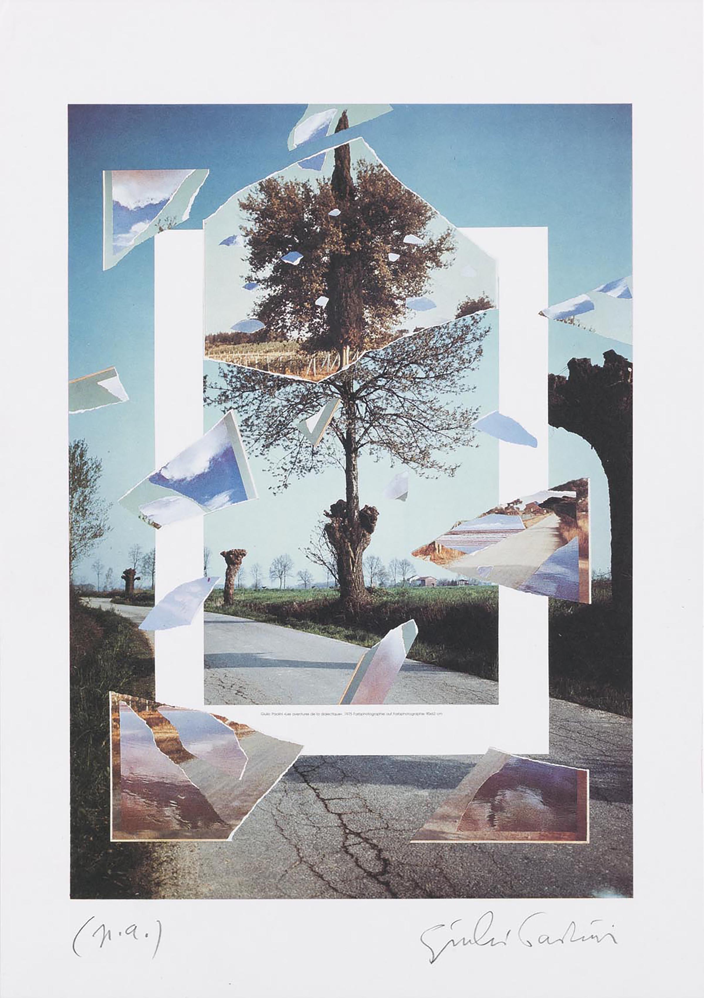 La veduta di una strada fiancheggiata da alcuni alberi presenta al centro un albero che cresce all’interno di un altro tronco. In primo piano, una riproduzione della prima versione di Les aventures de la dialectique – un’opera su carta realizzata nel 1975 (GPC-0372) – è lacerata in frammenti, in modo però da lasciare intatto, alla maniera di un passe-partout, il margine bianco della pagina a stampa, recante in basso al centro la didascalia dell’opera in lingua tedesca. Il frammento principale, raffigurante un cipresso nato dentro una quercia, è innestato sulla coppia di alberi al centro dell’immagine di sfondo, in modo da raddoppiare l’innesto vegetale, posto in risalto dall’inquadratura bianca.