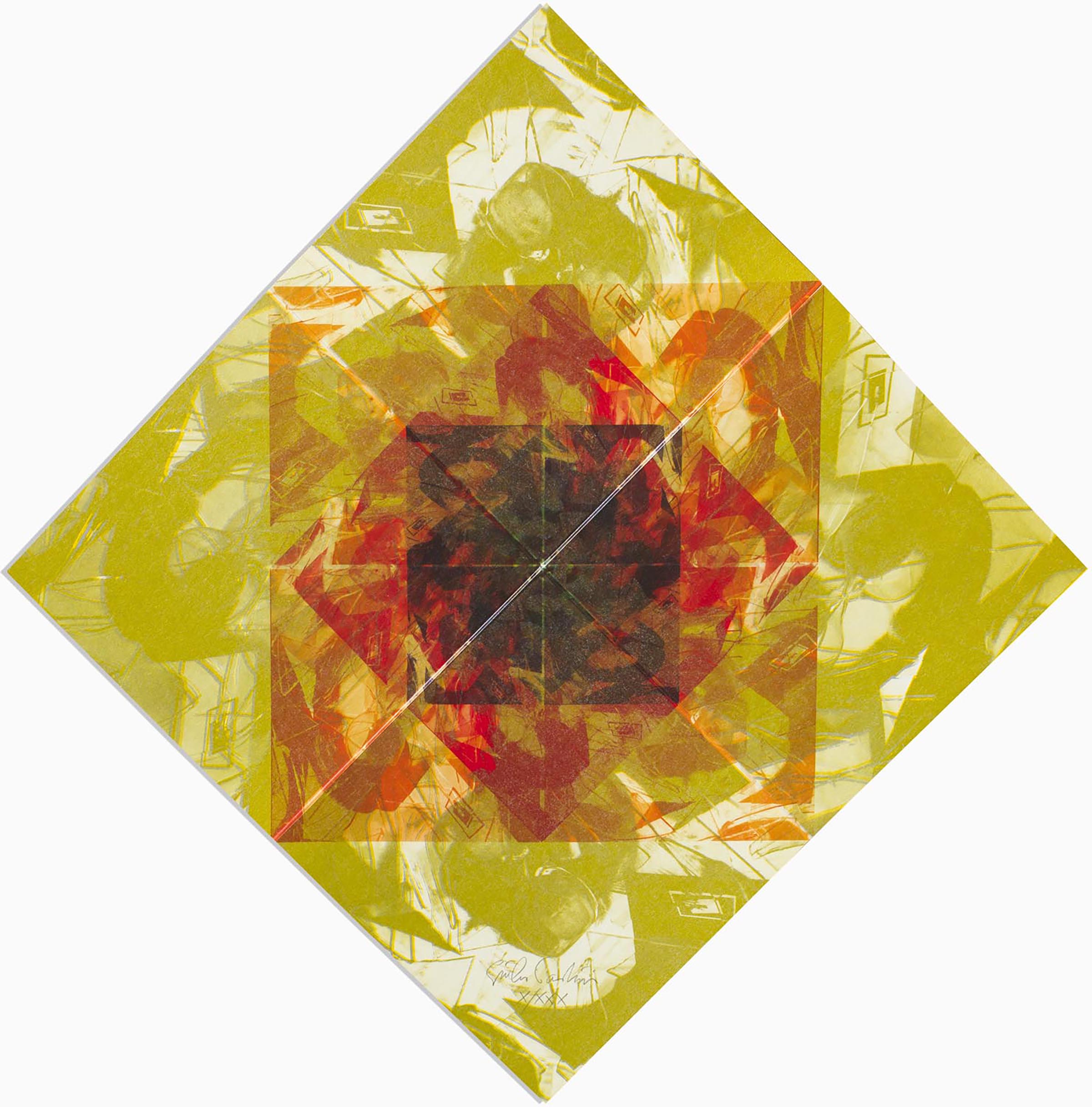 Cartella in cartoncino avorio, a tre ante a portafoglio, formato chiuso 33.5 x 34 cm; in copertina titoli in nero (editore, autore, titolo). Contiene la tavola ripiegata, inserita alla terza facciata in apposita sagomatura; alla quinta facciata, una nota dell’artista e il colophon.