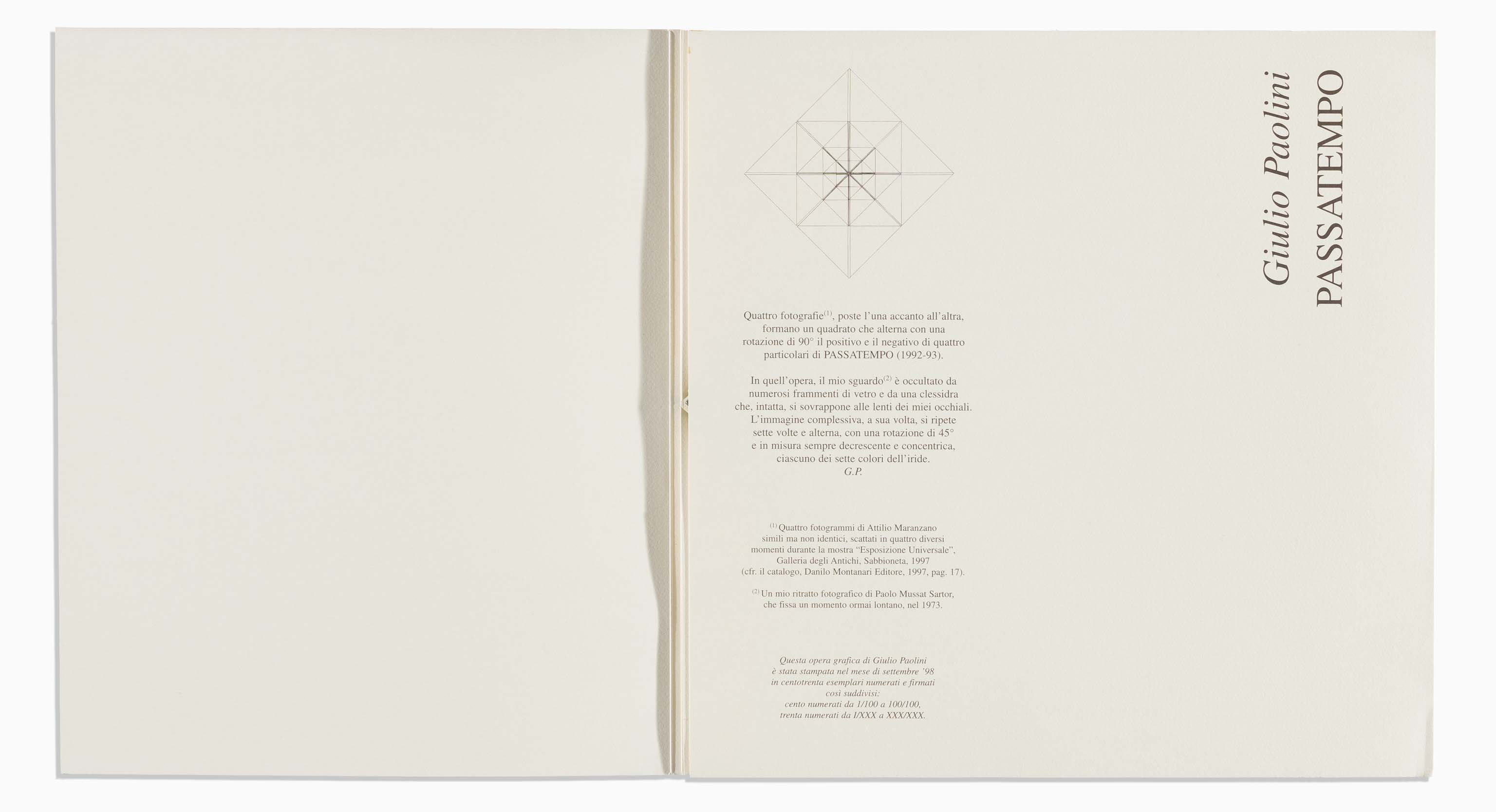 L’edizione è descritta e presentata dall’artista stesso in una nota riprodotta nella cartella che la contiene: "Quattro fotografie, poste l’una accanto all’altra, formano un quadrato che alterna con una rotazione di 90° il positivo e il negativo di quattro particolari di Passatempo (1992-98)1. In quell’opera, il mio sguardo2 è occultato da numerosi frammenti di vetro e da una clessidra che, intatta, si sovrappone alle lenti dei miei occhiali. L’immagine complessiva, a sua volta, si ripete sette volte e alterna, con una rotazione di 45 gradi e in misura sempre decrescente e concentrica ciascuno dei sette colori dell’iride”.