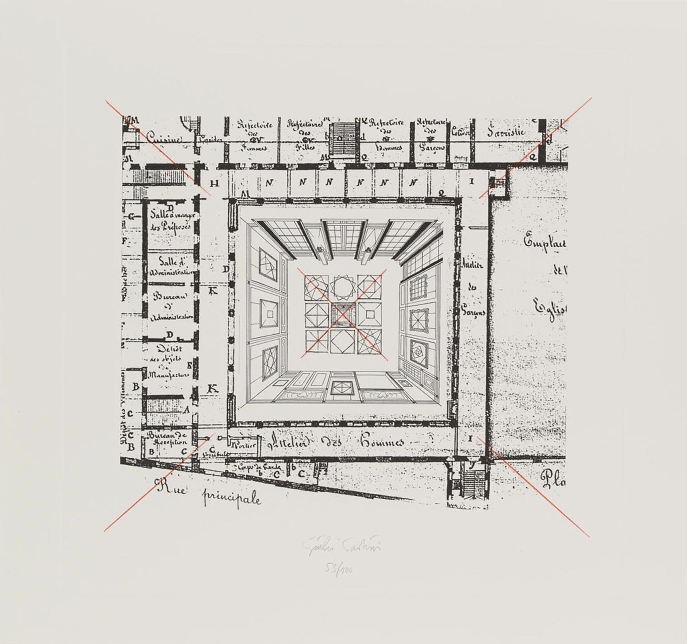 Nell’area centrale dell’antica planimetria di un convento francese l’artista ha inserito il disegno di un ambiente visto dall’alto, con sette quadri alle pareti1, recanti disegni geometrici (losanghe, quadrati, squadratura della superficie ecc.). Al centro dell’ambiente, nove riquadri accostati a formare una composizione quadrata propongono disegni simili a quelli associati ai quadri alle pareti della stanza; l’assieme dei nove quadrati è segnato dall’incrocio delle diagonali, delineate in rosso e proseguite nella “cornice” perimetrale della planimetria.