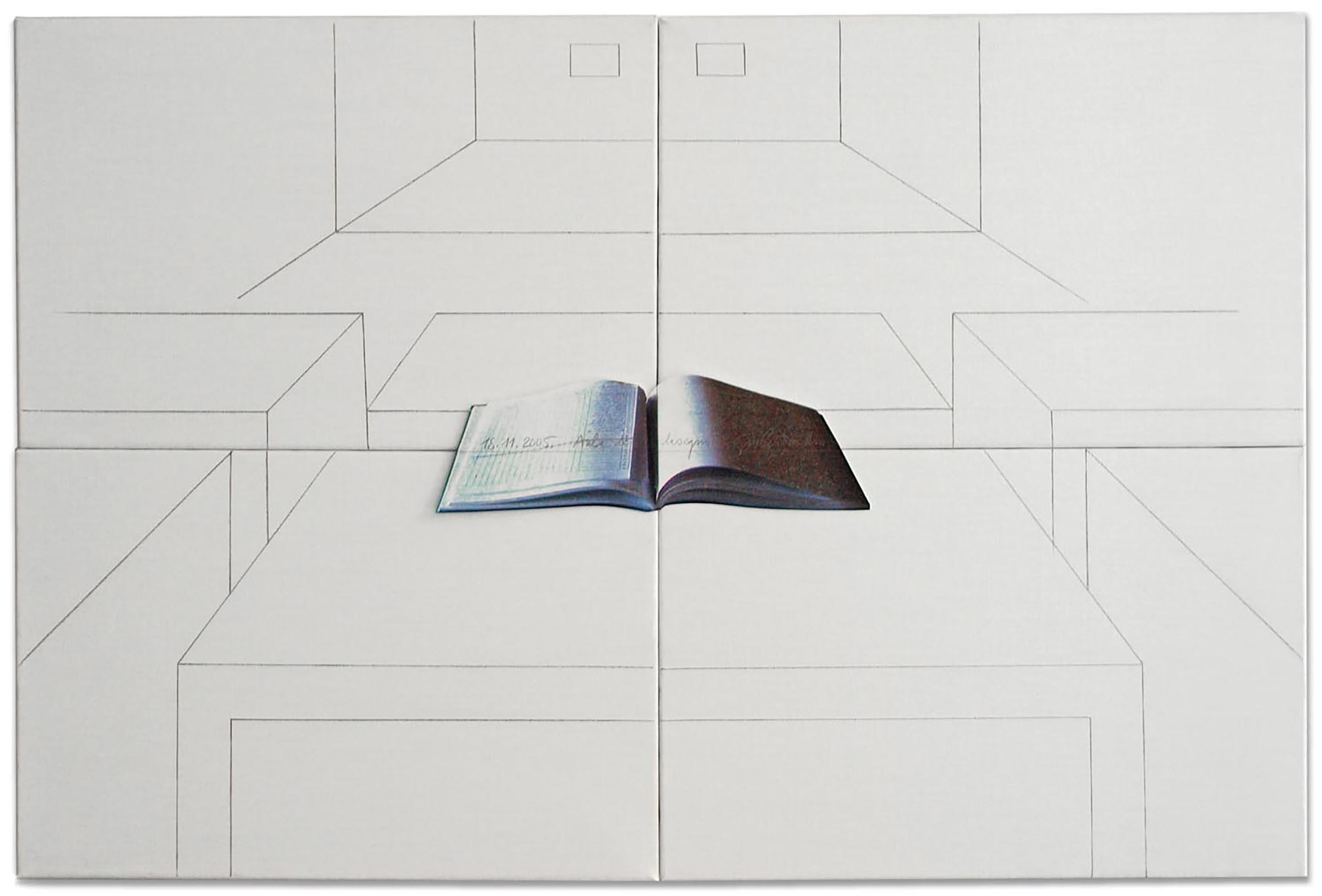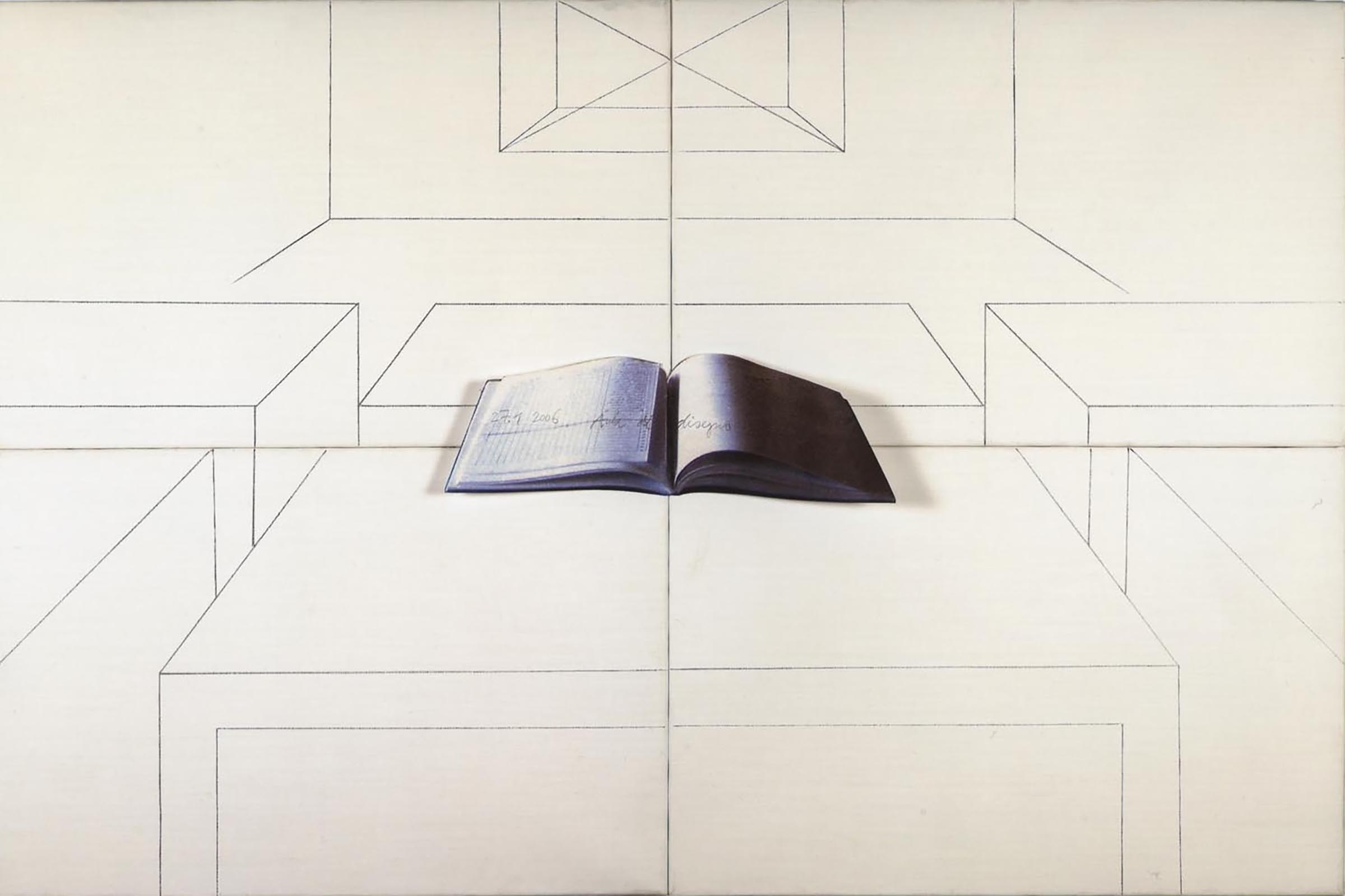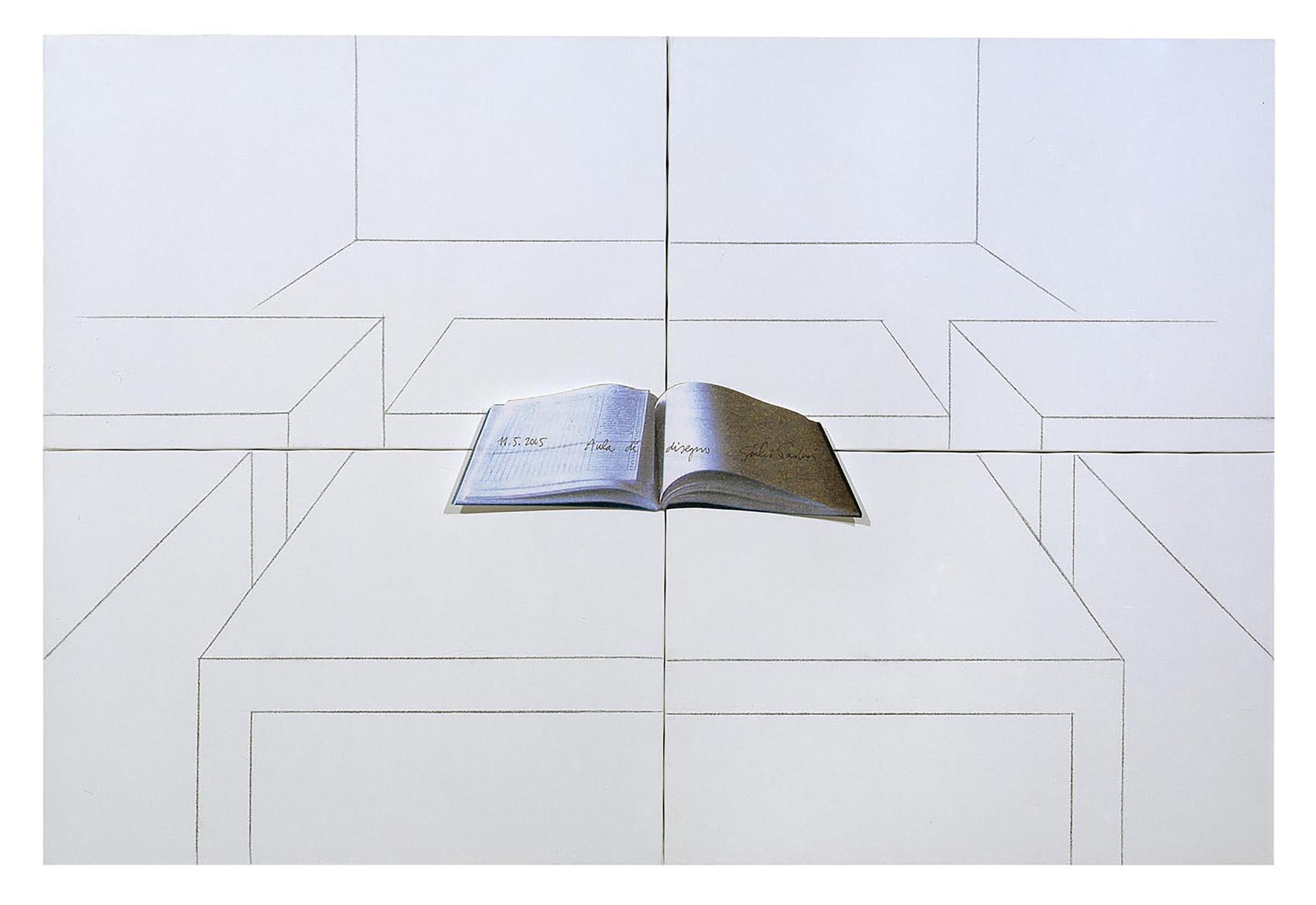 Quattro tele preparate, unite al verso, presentano il disegno in prospettiva di un’“aula di disegno” con alcuni tavoli, mentre sulla parete di fondo si staglia il disegno di un (ri)quadro, articolato da un tracciato geometrico variabile da un esemplare all’altro1. Al centro, nel punto di contatto delle quattro tele, è applicata la riproduzione fotografica di un registro scolastico che riporta in calligrafia autografa una data variabile, il titolo dell’edizione e la firma dell’autore.