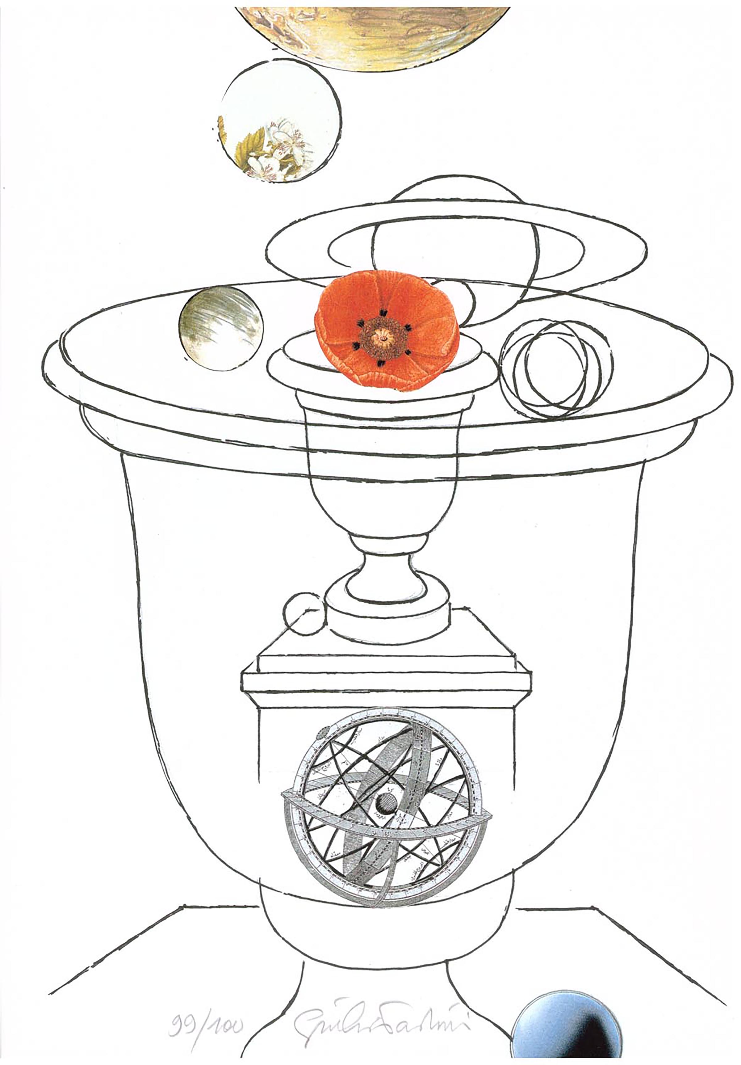 Il profilo disegnato di un vaso da fiori, posato su un piedistallo, accoglie al suo interno una replica della propria immagine in formato ridotto. Il vaso è posto in dialogo con alcuni elementi circolari, a carattere astronomico e botanico, che si avvicendano dall’alto, come figure di una composizione in divenire.