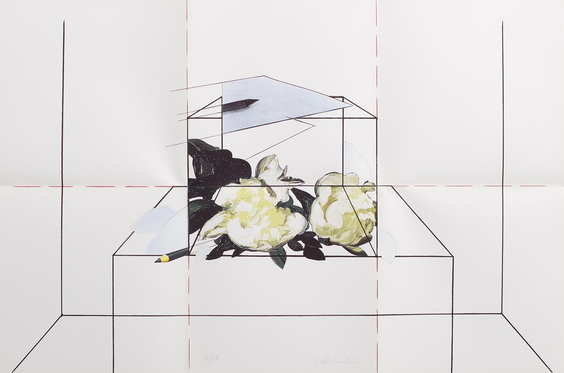 Il disegno, riprodotto al vivo sul foglio piegato tre volte, propone un ambiente in prospettiva, con un tavolo al centro, sul quale si trova una teca che ospita due peonie bianche, riprese da un dipinto di Édouard Manet1. Sul tavolo sono posati anche una matita e alcuni frammenti di carta bianca che richiamano le foglie delle peonie. Sopra la teca sono appoggiati un foglio bianco e una matita, mentre un altro foglio, appena abbozzato, sembra in caduta libera. Un tracciato tratteggiato in rosso segue le piegature del foglio e nel contempo suddivide il piano dell’immagine.