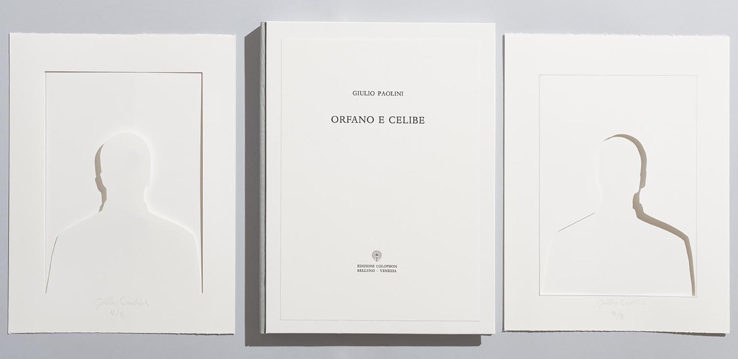 Giulio Paolini, Orfano e celibe, Edizioni Colophon, Belluno-Venezia 2016. 40.5 x 30.7 cm, 66 pagine, brossura. Scritti in versi dell’autore, seguiti da note ai testi, senza illustrazioni. Edizione senza tavole: copertina morbida e sovracoperta, tiratura 100 copie in numeri romani. Edizione con allegate tavole fuori testo: legatura cartonata con dorso in tela, il piatto anteriore reca applicato un foglio di carta Amatruda puro cotone, leggermente più piccolo, con titoli in nero, tiratura 78 copie in numeri arabi, in lettere e ad personam.
