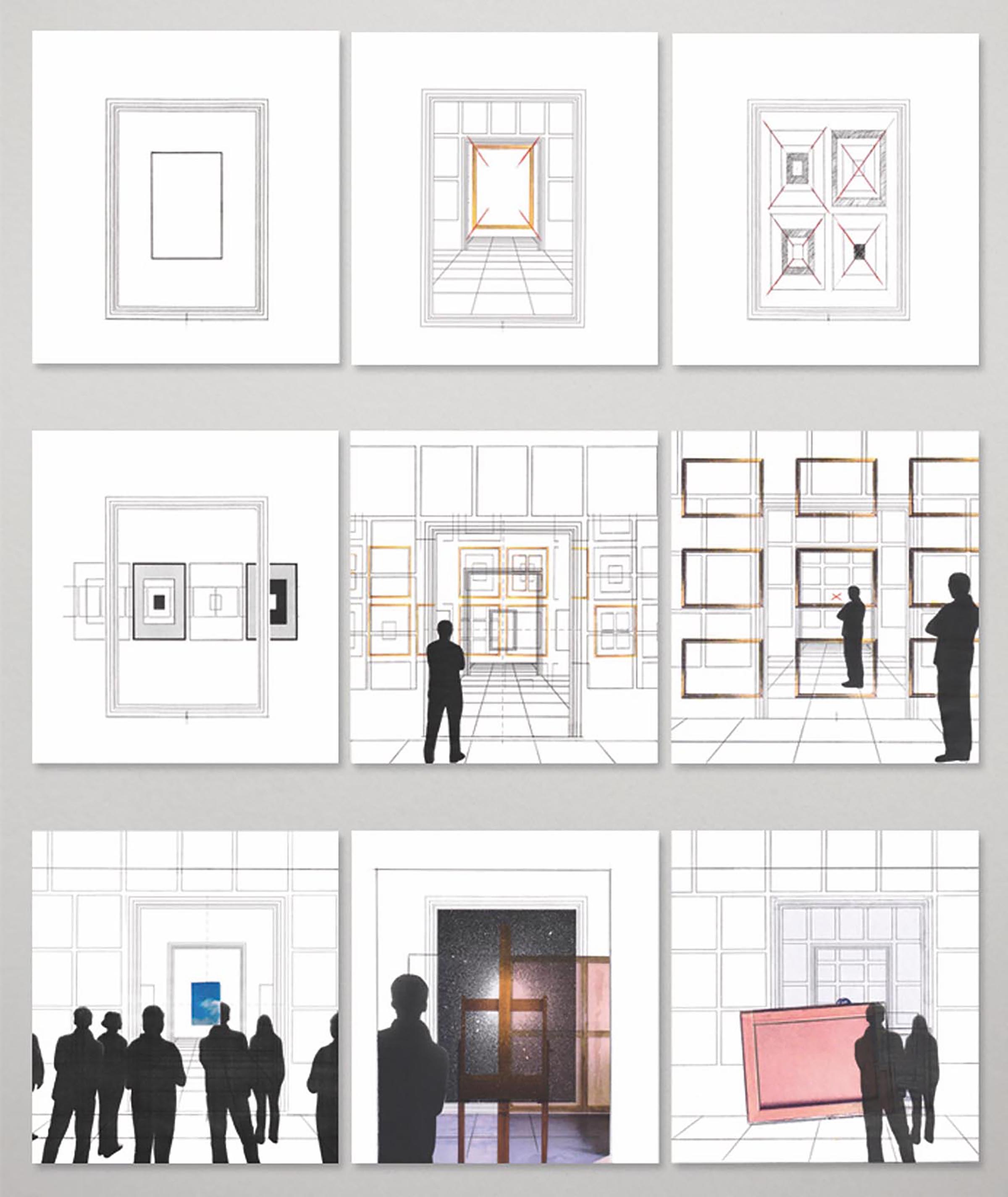 Le nove tavole propongono una serie di inquadrature, che di volta in volta si fanno più complesse, moltiplicandosi come in un gioco combinatorio. La cornice iniziale che inscrive un riquadro singolo diventa soglia di una stanza vista in prospettiva, poi di un’infilata di stanze con fitte quadrerie. Dalla quinta tavola in poi, si aggiungono alcuni spettatori, visti di spalle e rivolti verso il punto di fuga della rappresentazione prospettica (un quadro cieco, uno scorcio di cielo, un’immagine siderale).
