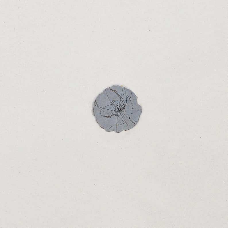 Al centro della tela preparata di formato tondo, il minuscolo frammento a forma circolare strappato dalla pagina di un atlante geografico raffigura l’universo, che per sineddoche include anche Buenos Aires, città natale di Jorge Luis Borges, cui l’opera rende un implicito omaggio.