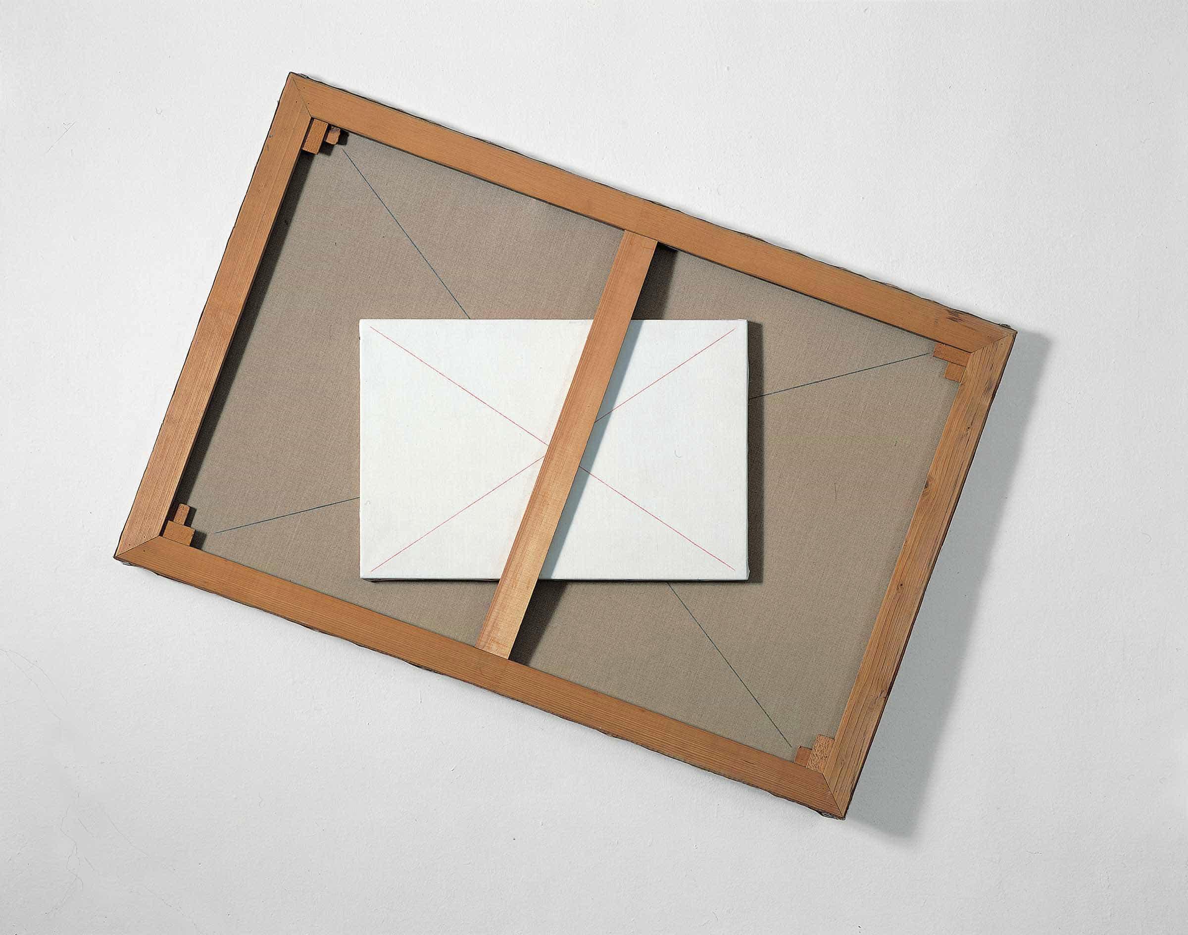 Una tela rovesciata con le diagonali segnate a matita e sospesa a parete in posizione inclinata trattiene nel listello del telaio, allestito in orizzontale, una tela orientata al recto con le diagonali segnate a matita rossa.