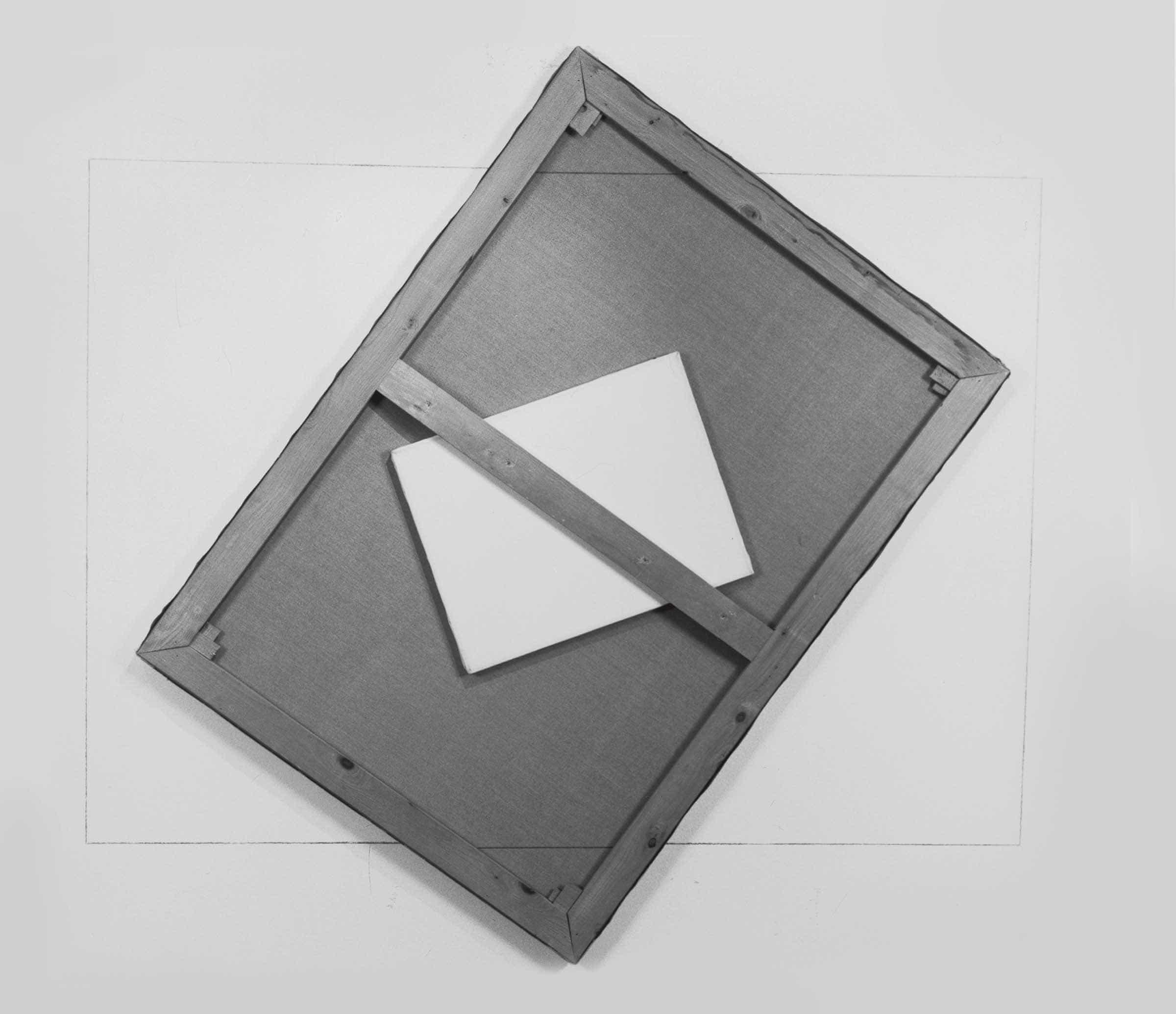 Due tele di diversa misura, allestite in posizione inclinata e orientate in senso contrapposto – quella grande è rovesciata, quella più piccola è visibile al recto – sono abbinate a un riquadro disegnato a parete in posizione diritta. Nei punti in cui la tela capovolta si sovrappone al disegno, il tracciato è proseguito sulla tela.