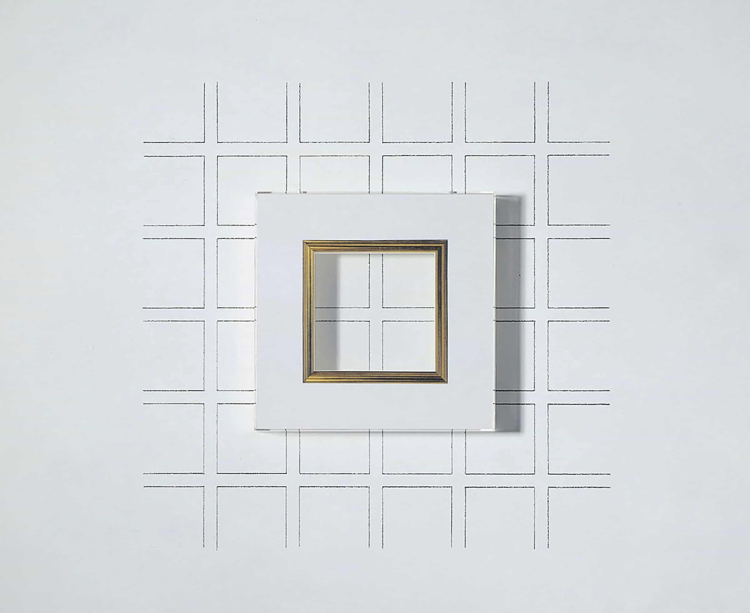 La doppia “cornice” vuota contenuta nella teca di plexiglas è costituita da un passe-partout bianco, che in corrispondenza del bordo interno reca applicata la riproduzione scontornata di una cornice dorata. Sulla parete, il disegno di una fitta trama di quadrilateri moltiplica il formato quadrato dell’elemento incorniciato.