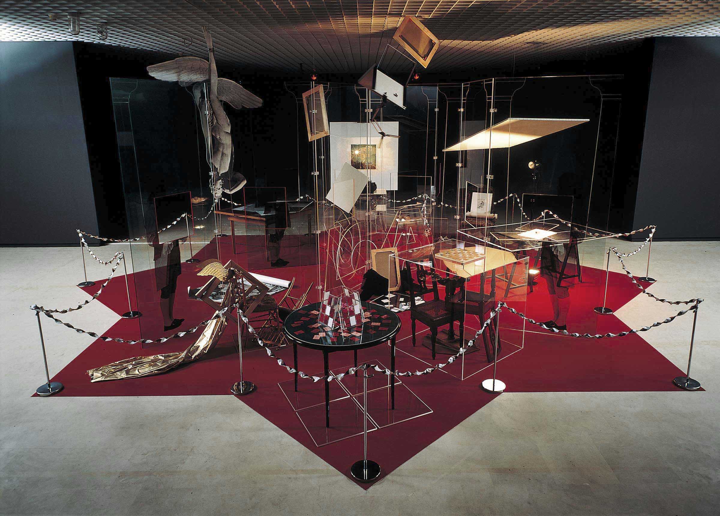• 1999, Torino, GAM Galleria Civica d’Arte Moderna e Contemporanea: il nastro è sostenuto da sedici pilastrini; le tele sospese sono quattro; la tela al suolo è orientata al verso.
