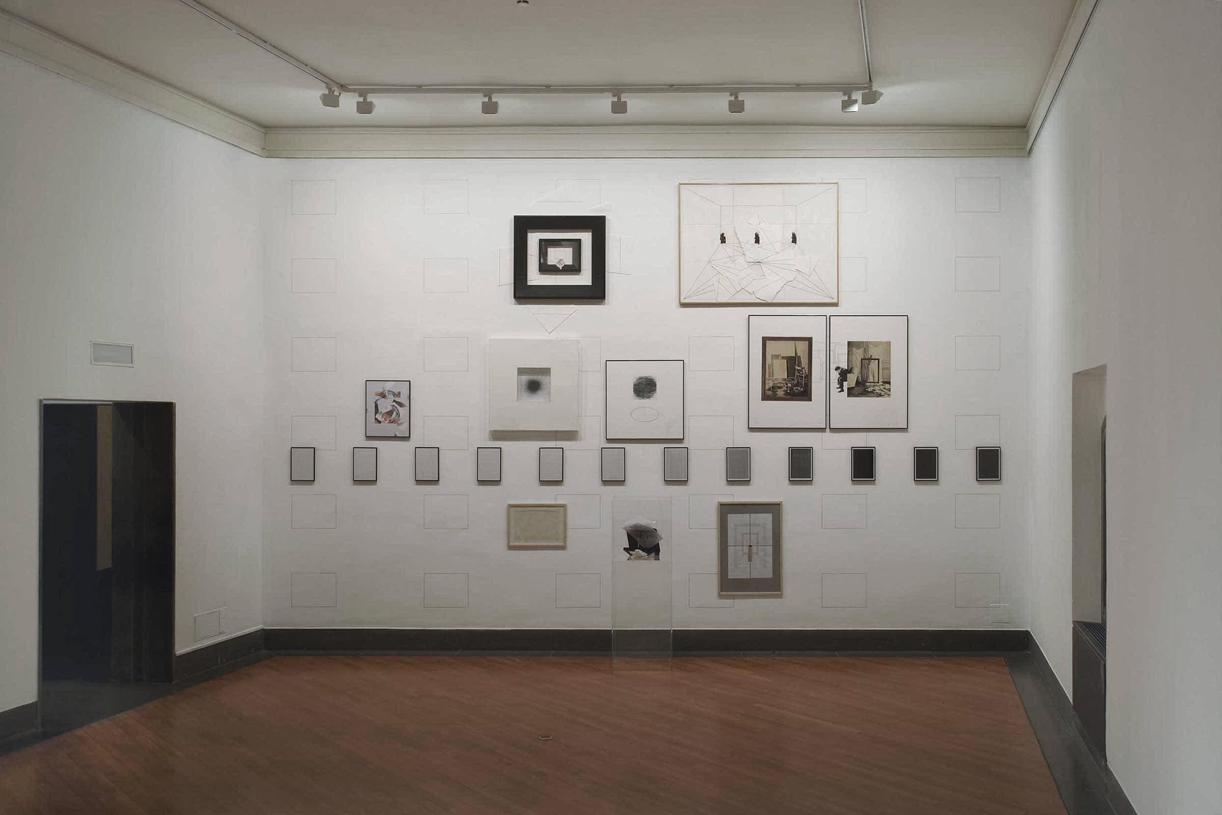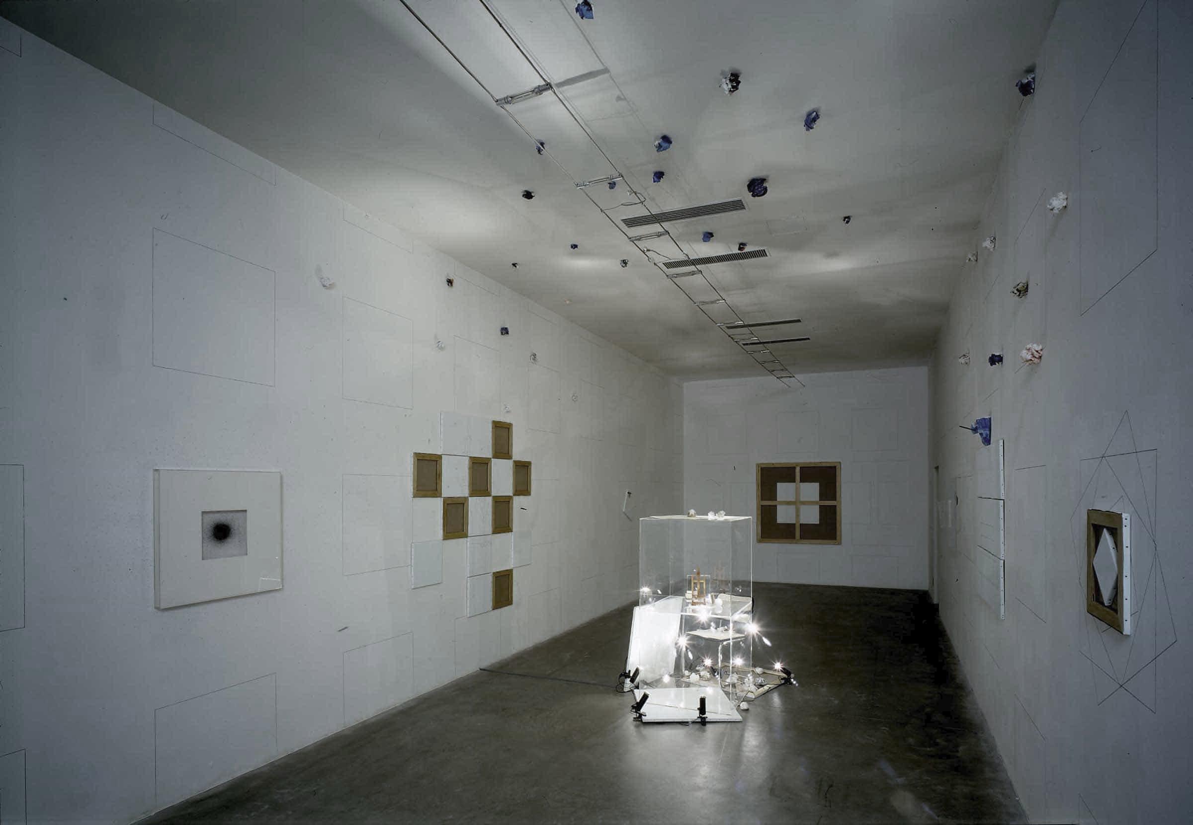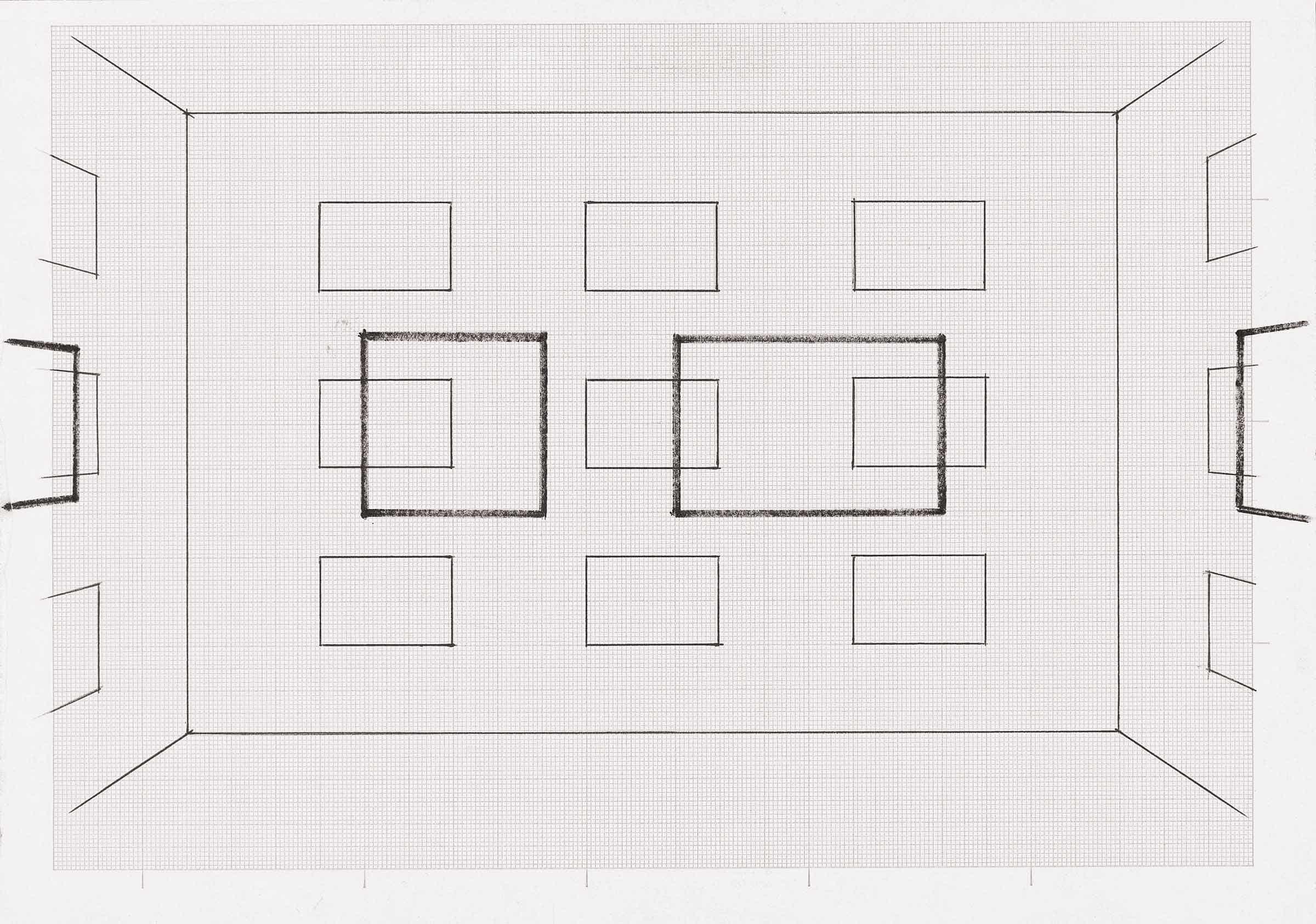 • 1999, Weimar, Neues Museum: l’unità di misura della griglia (100 x 100 cm) sviluppata su quattro ordini paralleli è determinata dalle dimensioni di Senza titolo (GPO-0073). La sequenza del disegno appare sia intersecata da quadri di varie misure sia interrotta da vuoti corrispondenti a lavori tridimensionali in mostra.