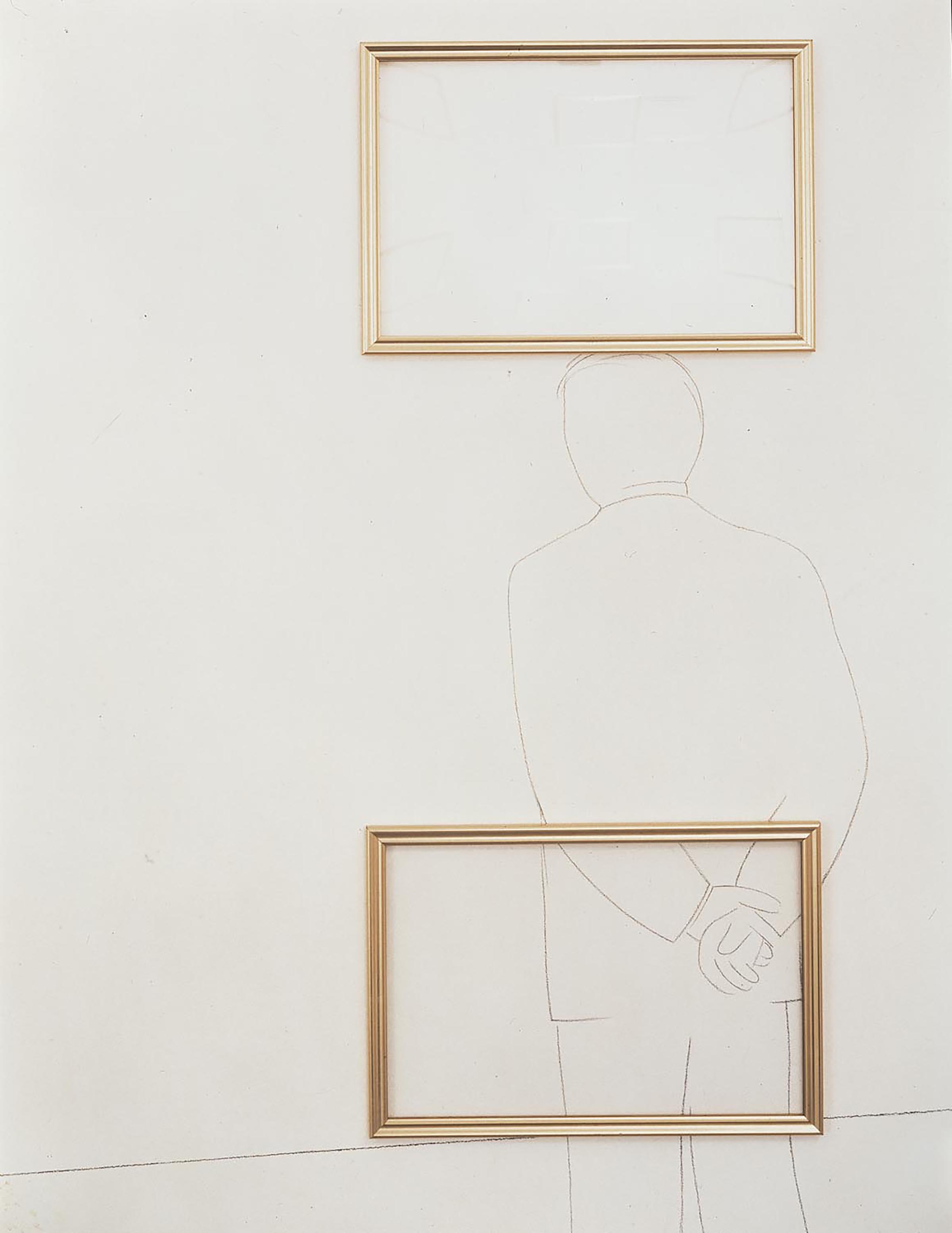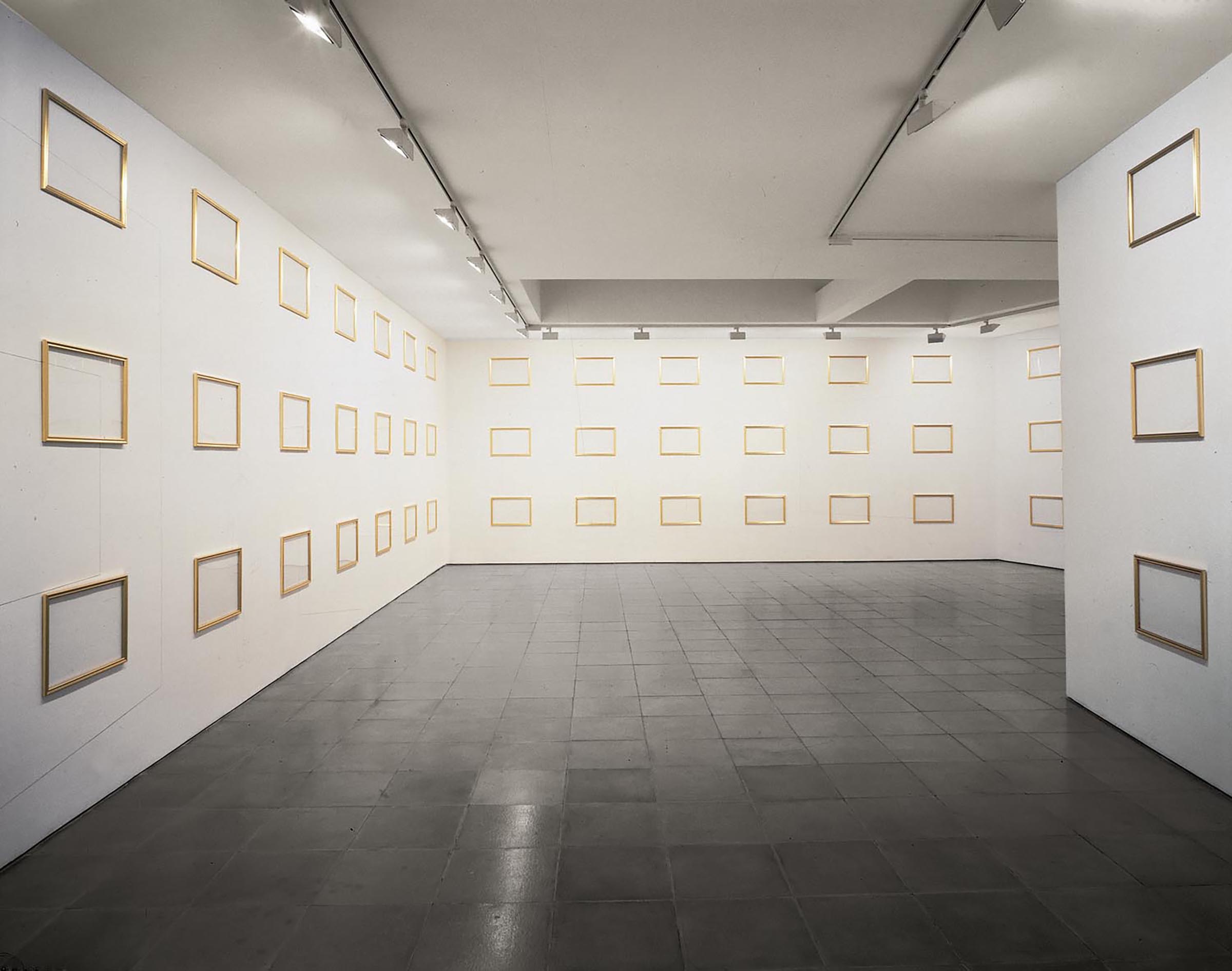 Le cornici dorate, in numero variabile secondo la situazione espositiva, sono allineate a intervalli regolari e in ordini paralleli sulle pareti dell’ambiente a costituire una “quadreria”. Sulle pareti, un disegno tracciato a matita evoca un ambiente in prospettiva, animato dal profilo in grandezza al vero di alcuni spettatori, come a rispecchiare la situazione stessa in cui si trova l’osservatore dell’opera o il visitatore della mostra.