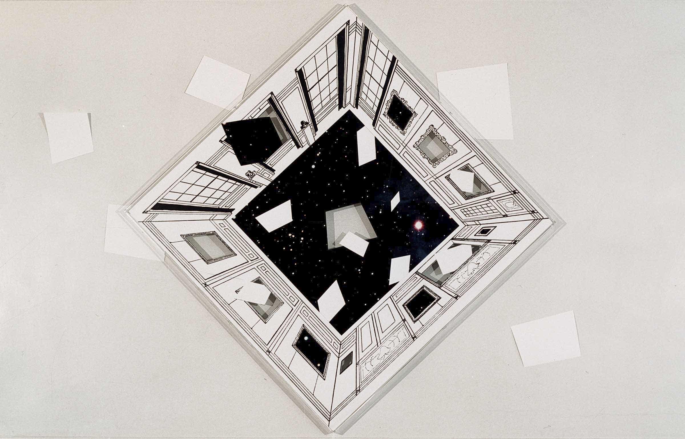 L’opera basata su un ribaltamento percettivo si compone della riproduzione del disegno di una stanza vista dall’alto, in cui il pavimento coincide, paradossalmente, con l’immagine a colori di un cielo stellato. L’effetto trompe-l’œil è rafforzato dai riquadri di carta da disegno, sparsi dall’esterno della stanza virtuale verso il centro dell’immagine, fino a perdersi a una distanza di “anni luce” dal nostro sguardo (in corrispondenza dei quadri alle pareti, sei dei quali sono ritagliati, gli elementi di carta si alternano a particolari fotografici del cielo notturno). Nello stesso tempo, la fuga prospettica converge, al centro dell’immagine siderale, in un’apertura “cieca” che lascia intravedere il muro, l’unica dimensione che riusciamo a toccare “a occhio nudo”.