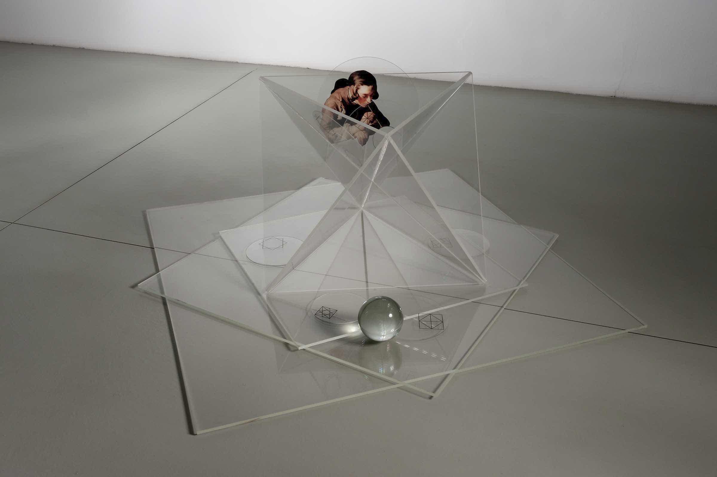 Poliedro e lastre di plexiglas, riproduzioni stampate su plexiglas, sfera di cristallo