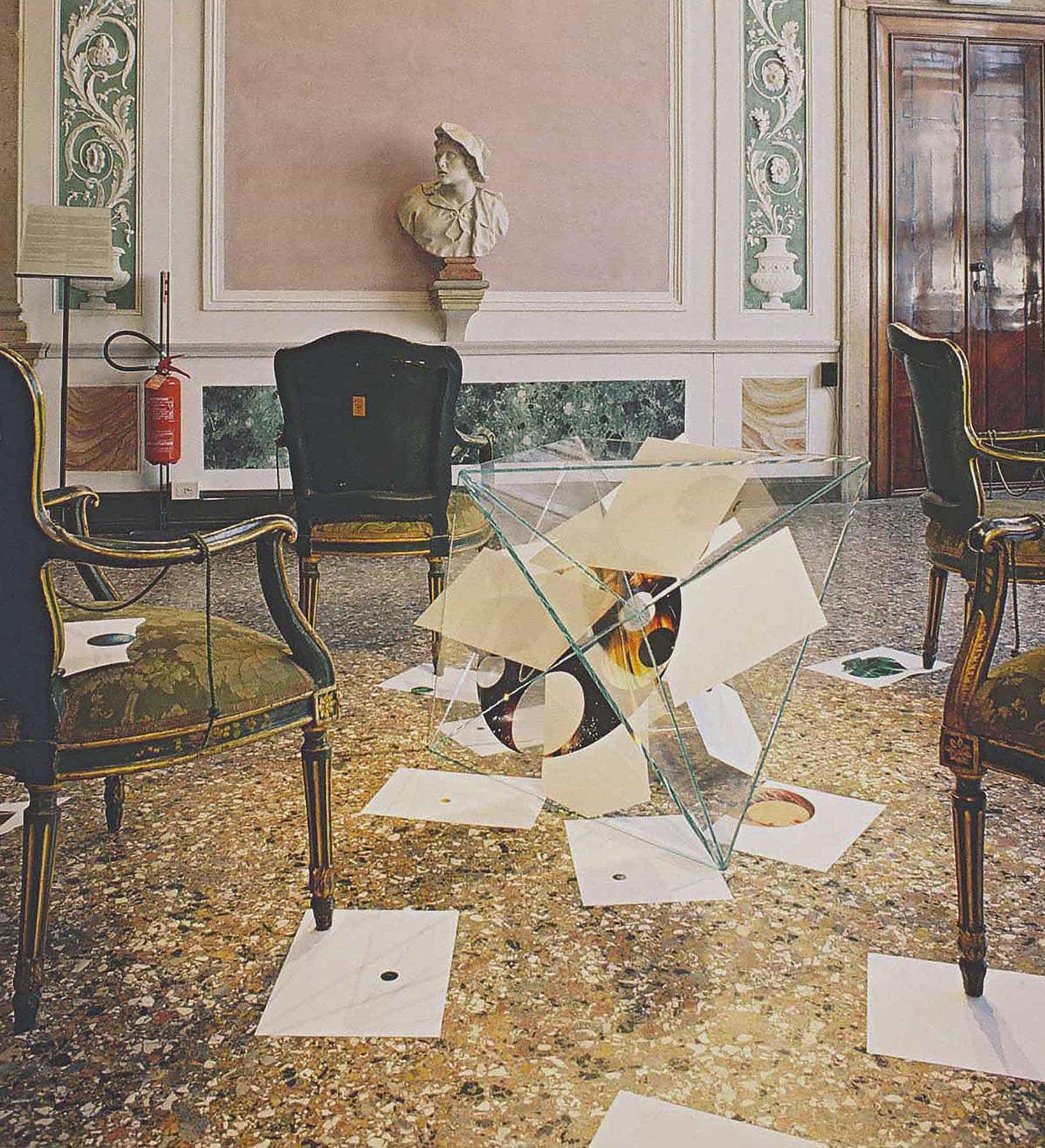 • 2004, Venezia, Fondazione Querini Stampalia: il poliedro di cristallo accoglie la riproduzione a colori del giovinetto di Chardin associato a un assieme di pianeti riprodotta su acetato e suddivisa in quattro parti, accostate su lati contigui del volume, in modo da ricomporre l’immagine e in modo che il tondo “soffiato” dal giovinetto si trovi al centro esatto del poliedro. Sui lati del volume sono inoltre appoggiati dei fogli bianchi, con riproduzioni di pianeti o con un ritaglio circolare che suggerisce in negativo la sagoma di un pianeta. Al suolo sono sparsi tutt’intorno, altri particolari di pianeti riprodotti su acetato con viraggi diversi e allestiti su fogli bianchi lacerati, come fossero “bolle di sapone” deflagrate dal nucleo centrale. Il poliedro è collocato nell’area centrale dell’ambiente, delimitata da quattro poltroncine (prelevate dagli arredi dell’ambiente), orientate in vario modo a evocare una “scena di conversazione”.