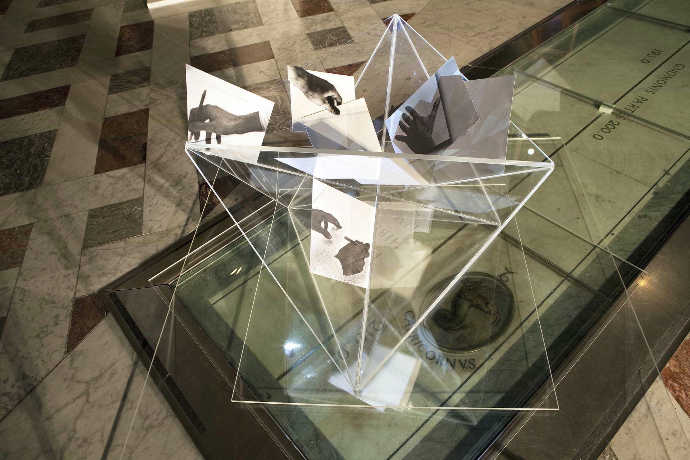 • 2009, Napoli, Museo Archeologico: il poliedro (ora in plexiglas in sostituzione di quello originario troppo pesante da spostare) accoglie sette riproduzioni fotografiche delle mani dell’artista mentre realizza Vedo (la decifrazione del mio campo visivo), 1969 o trattiene un foglio bianco o una matita (alcune fotografie sono abbinate a due a due), come a dare letteralmente corpo ai propri tentativi di toccare l'incognita. Il volume è collocato su tre lastre di plexiglas di diverso formato e fra loro sfalsate. In mostra l’opera è allestita al centro del Salone, in corrispondenza dell’estremità della Meridiana incassata nel pavimento.