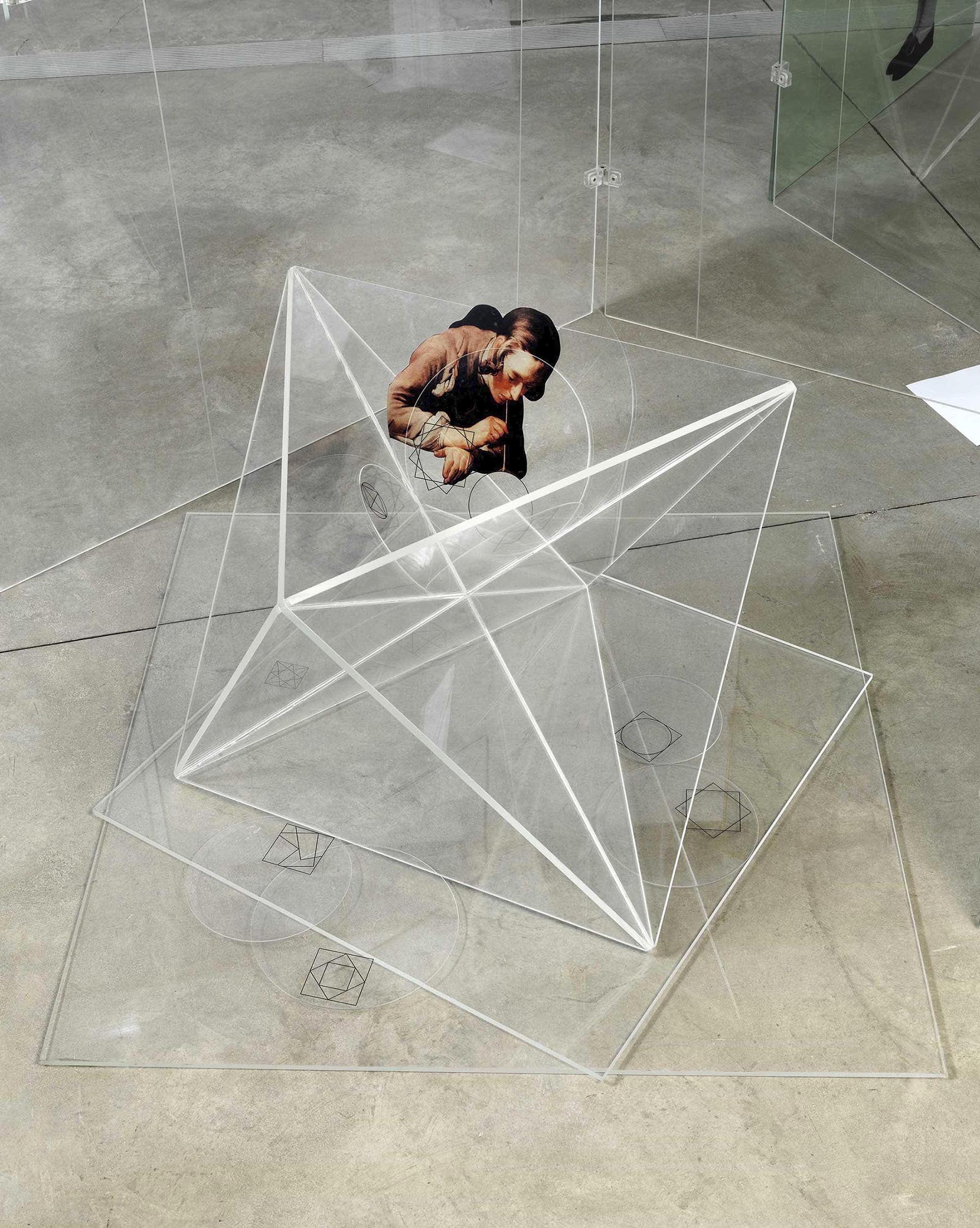 Il poliedro di plexiglas, allestito su tre lastre trasparenti fra loro sfalsate, accoglie l’immagine a colori, stampata su plexiglas, del soffiatore di bolle di sapone ripresa da un dipinto di Jean-Baptiste-Siméon Chardin1. Nove tondi di plexiglas di varie dimensioni, allestiti accanto alla figura e sulle lastre al suolo, recano impressi i profili lineari di quadrati e cerchi. Una sfera di cristallo, posata su una delle lastre trasparenti, nell’asse ottico del soffiatore, materializza e amplifica le “bolle di sapone” soffiate dal giovinetto.