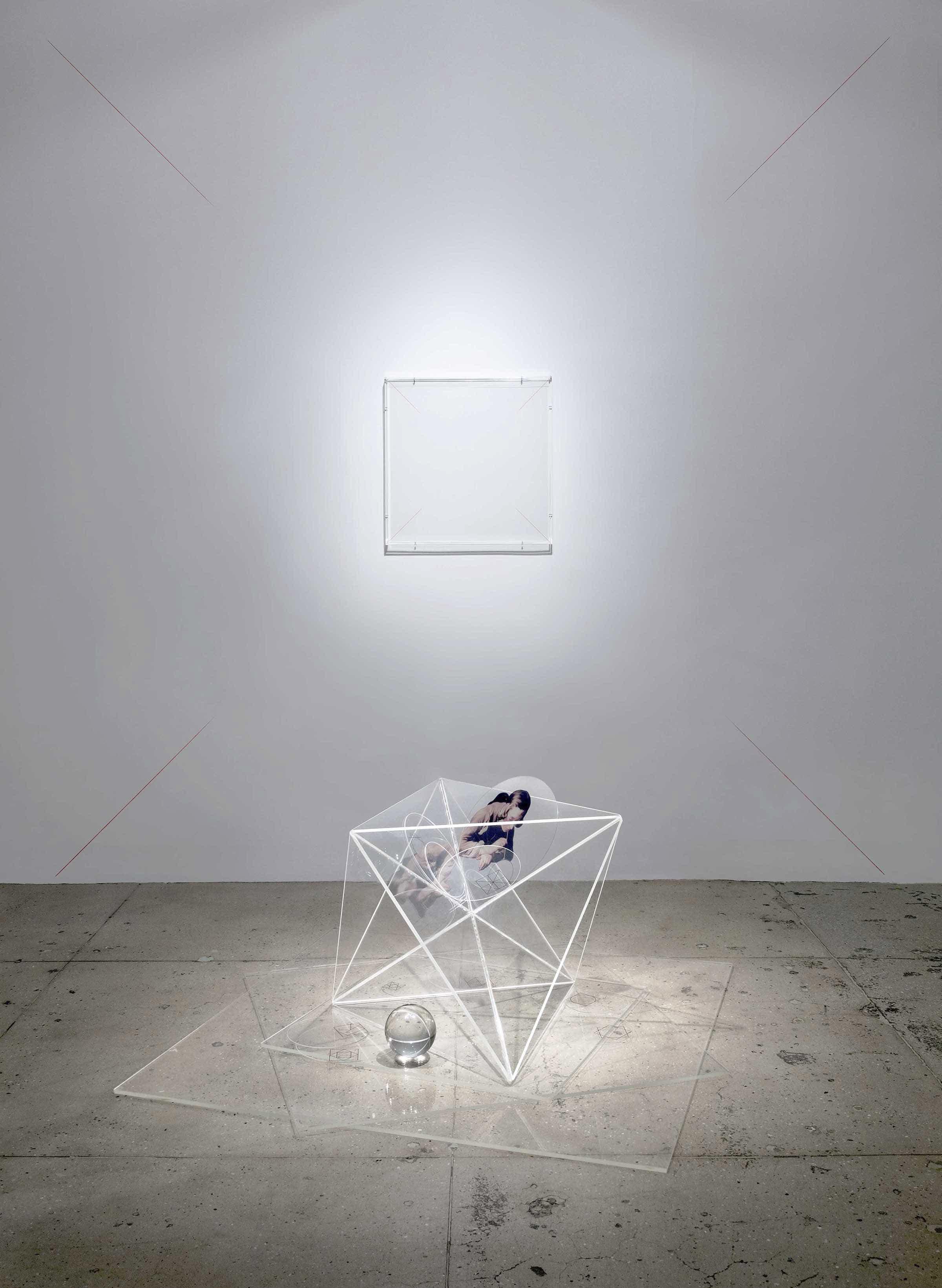 • 2015, New York, Marian Goodman Gallery: il poliedro, posato su tre lastre di plexiglas fra loro sfalsate, accoglie gli stessi elementi come a Roma e Londra, ma con l’aggiunta di una sfera di cristallo. L’opera è allestita davanti a una parete, che accoglie un nuovo intervento complementare: l’accenno delle diagonali di un ipotetico ampio quadrato, tracciate a matita rossa sulla parete, che al centro inscrive una teca di plexiglas vuota, la quale reca, analogamente in corrispondenza dei vertici, l’accenno alle diagonali, delineate a matita rossa sulla parete.