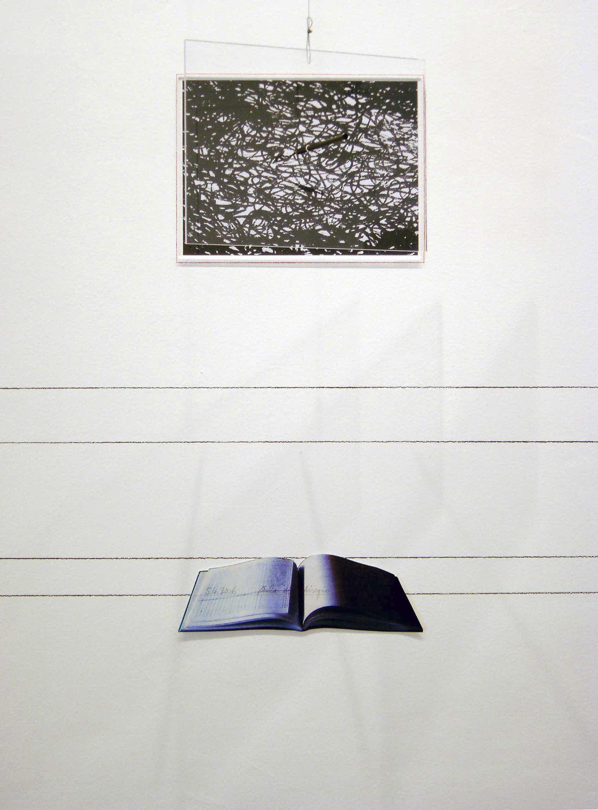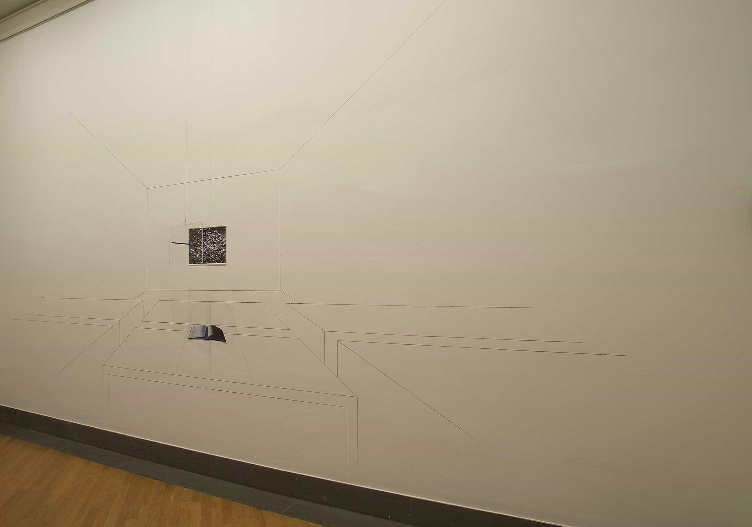 Stampa fotografica, lastre di plexiglas, matita nera, matita e collage su parete, cavo di acciaio