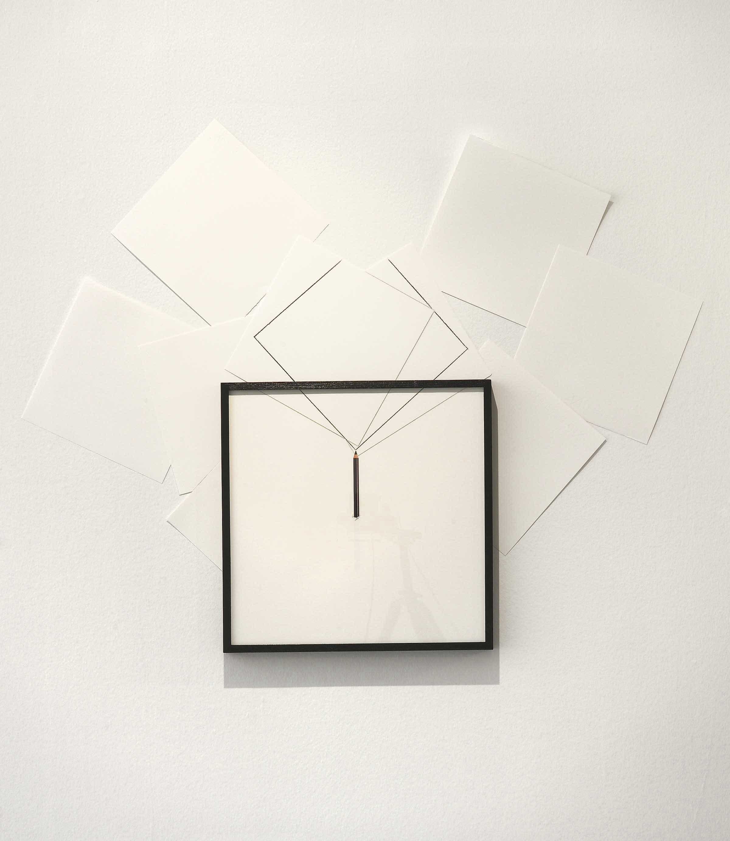 Al centro della cornice quadrata l’immagine di una matita nera orientata verso l’alto segna il punto d’origine di una profusione di fogli bianchi, anch’essi di formato quadrato, sviluppata sulla parete, così come di un riquadro dello stesso formato dei fogli, delineato a matita (sia il tracciato sia i fogli nascono all’interno della cornice e trovano un proseguimento all’esterno in un’illusoria continuità).