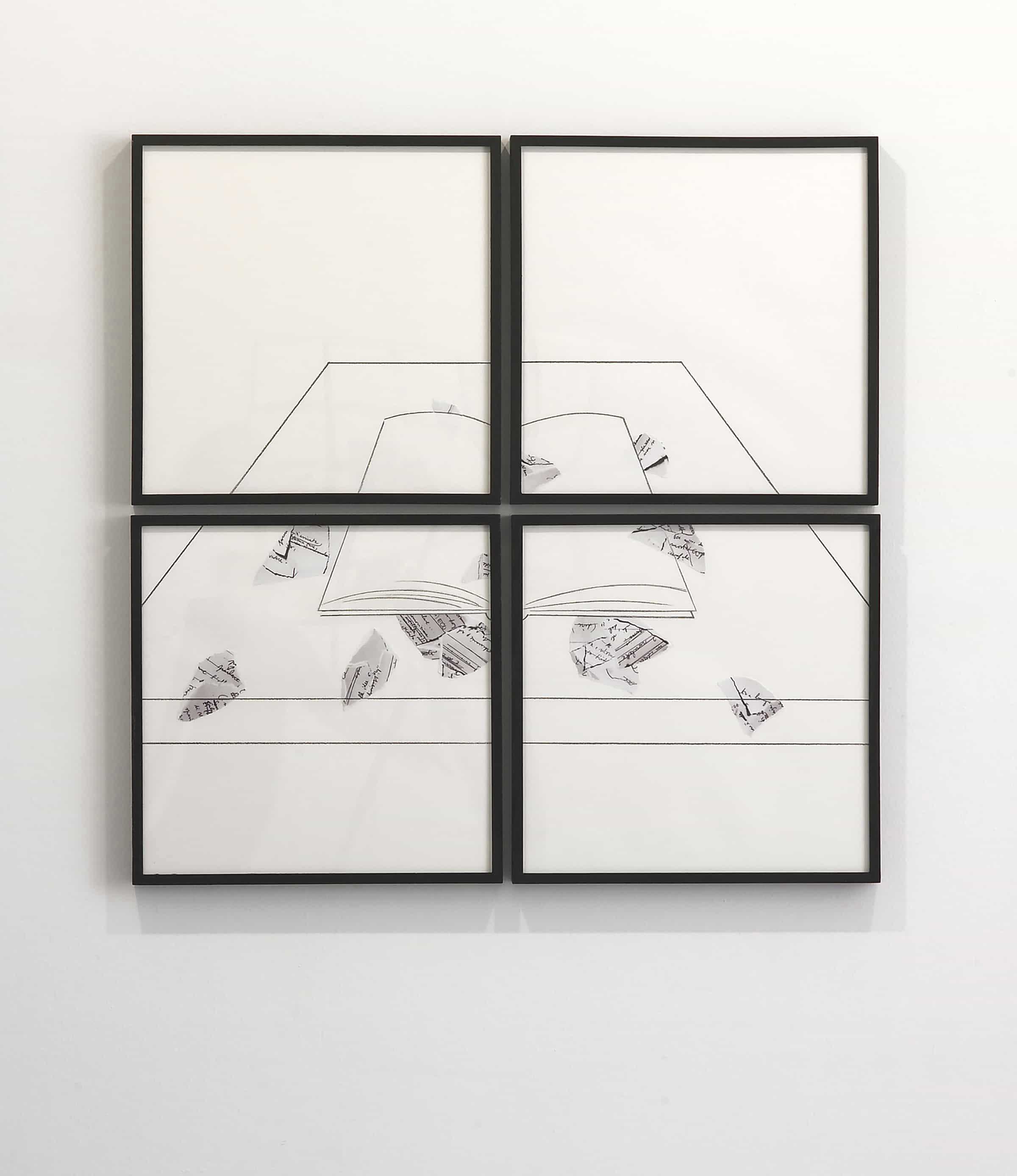 Quattro elementi accostati a brevi intervalli propongono il disegno in prospettiva di un tavolo, con al centro un album aperto, dal quale fuoriescono dei frammenti fotografici di riproduzioni di scritture autografe che si disperdono tutt’intorno.