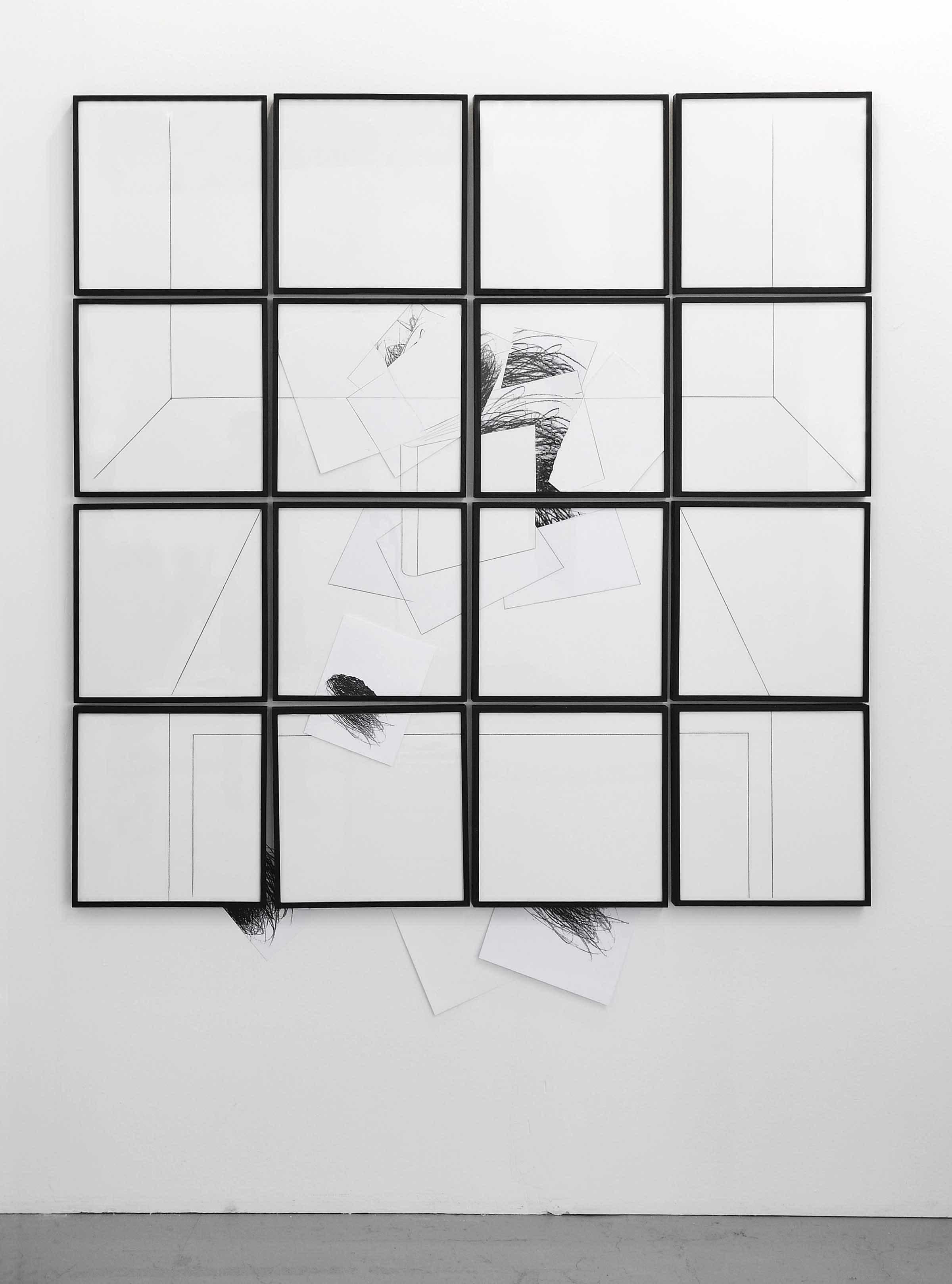 Sedici elementi accostati a brevi intervalli propongono il disegno in prospettiva di un ambiente con un tavolo al centro, sul quale si trovano un album da disegno, orientato in posizione eretta, e dei fogli sparsi, fuoriusciti dall’album, alcuni bianchi e altri anneriti a mano libera. Dei fogli veri – alcuni con un analogo disegno riempitivo – sono applicati sulle cornici e recano il proseguimento del tracciato a matita dove si sovrappongono al disegno; altri tre fogli sono applicati fuori dal “quadro”, sulla parete in basso.