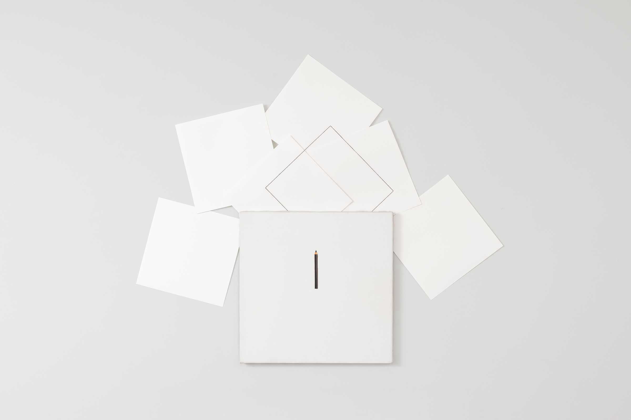 Al centro della tela preparata di formato quadrato l’immagine di una matita nera orientata verso l’alto segna il punto di origine di una profusione di fogli bianchi, anch’essi quadrati, sviluppata sulla parete, così come di un riquadro dello stesso formato dei fogli, delineato a matita (sia il tracciato sia i fogli nascono sulla tela e trovano un proseguimento all’esterno in un’illusoria continuità).