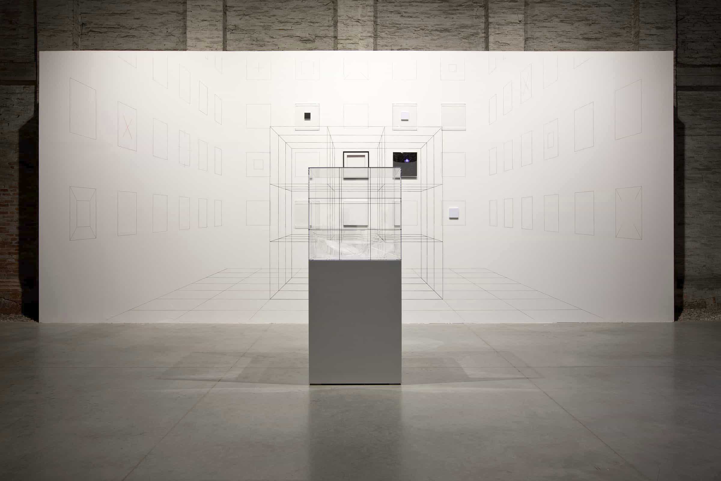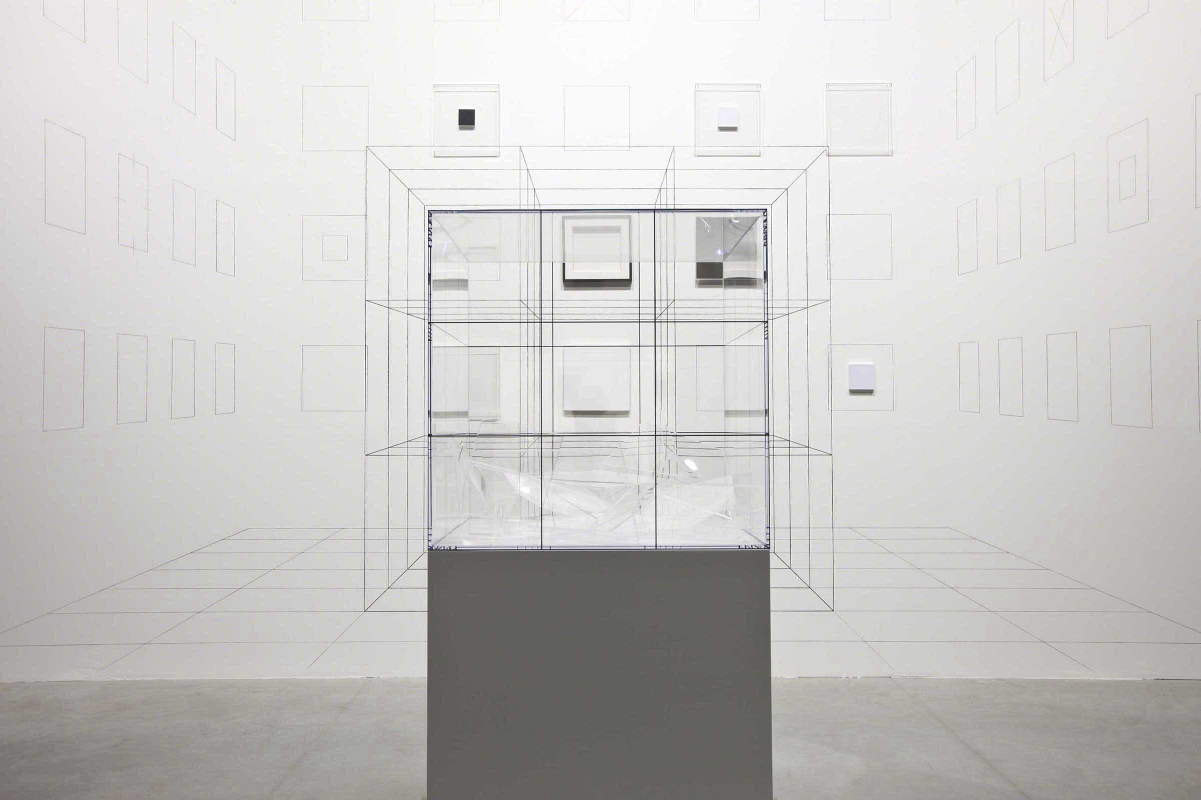 Elementi vari e disegno a matita su parete, base bianca, teca di plexiglas con disegno inciso, lastre di plexiglas