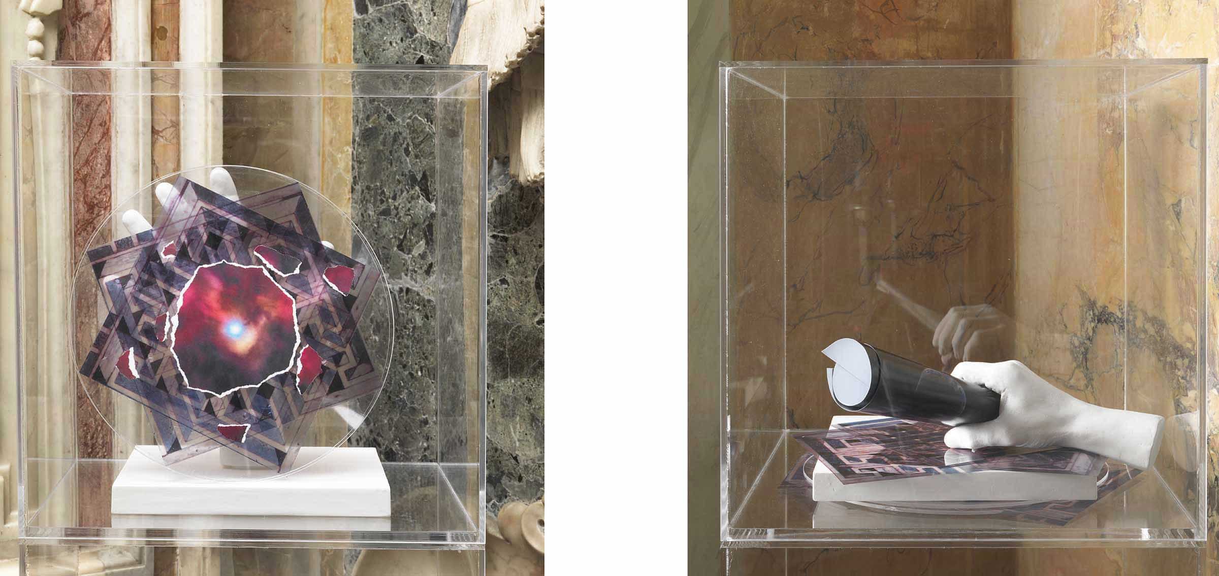 In un caso, la mano è aperta, orientata in posizione verticale, e gli elementi d’immagine trattenuti tra i dischi di plexiglas riproducono, oltre al pavimento, particolari di un’esplosione cosmica che allude al Big Bang. Nell’altro caso, la mano è chiusa, coricata sui tondi trasparenti, e trattiene una riproduzione fotografica della Terra.
