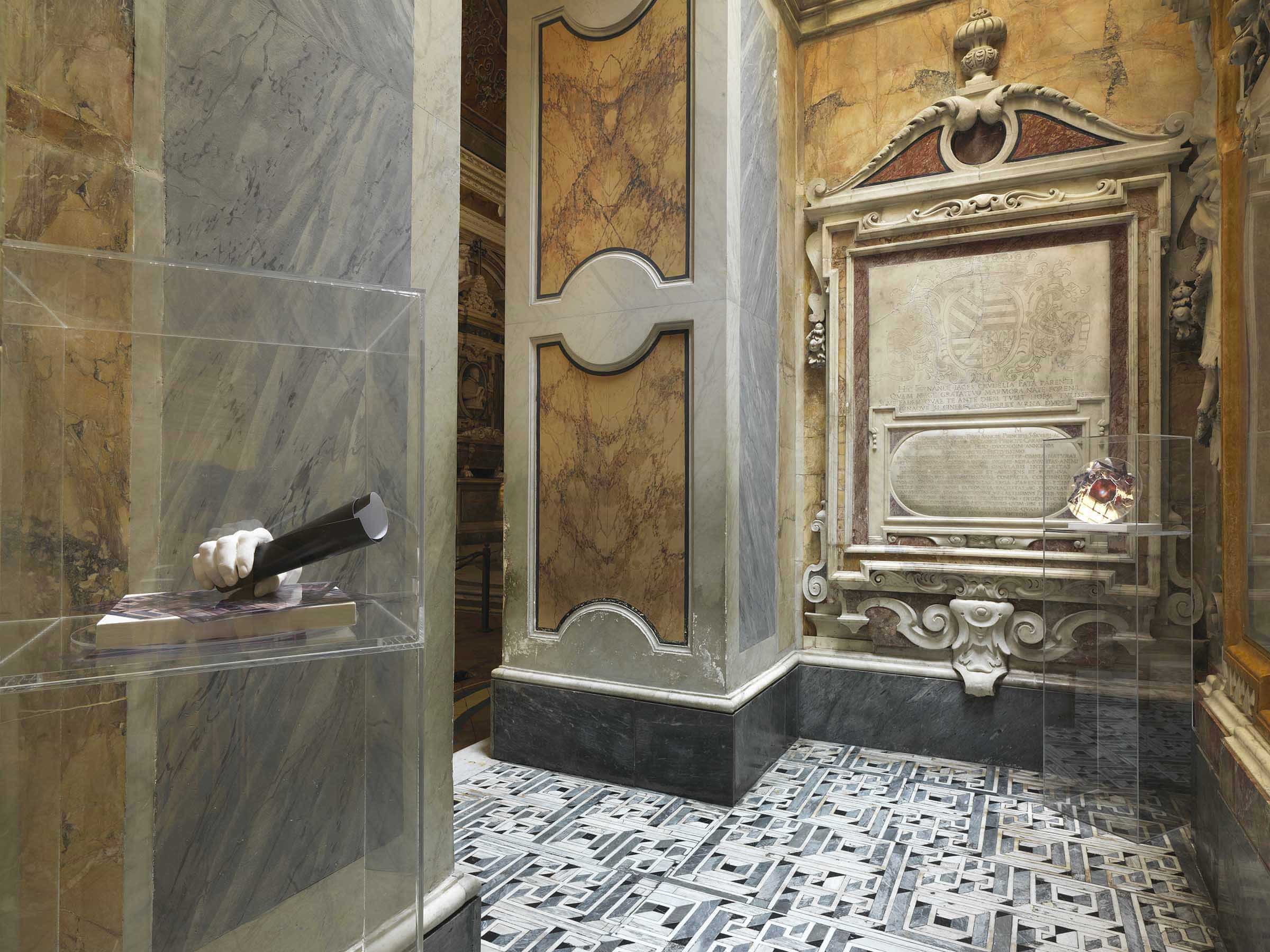 Negli intenti dell’artista, “i disegni delle croci e dei quadrati concentrici, dall’originario pavimento labirintico della Cappella, sono sovrapposti e collocati simmetricamente a evocare la distanza tra l’eco di un lontano Big Bang e l’orbita del pianeta Terra”; le due mani “sembrano fissare l’inizio e la fine di un itinerario ermetico e imperscrutabile”1.