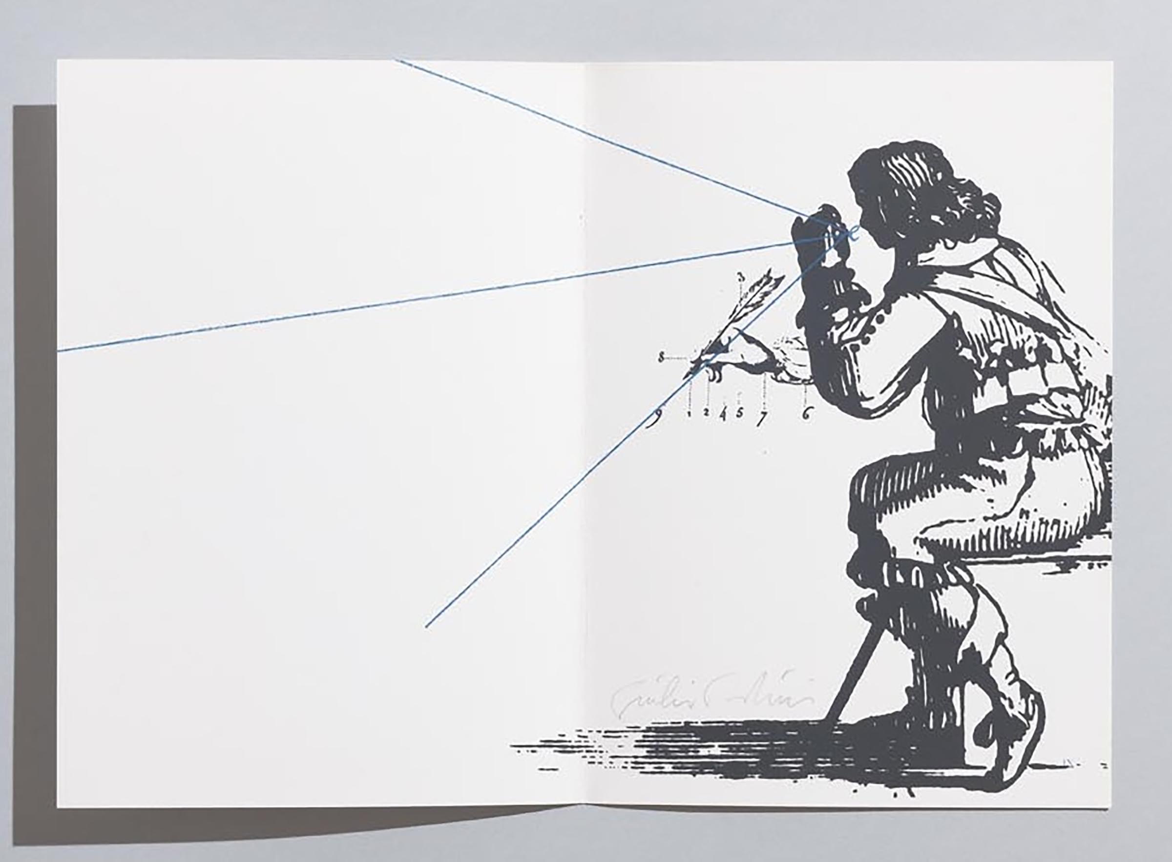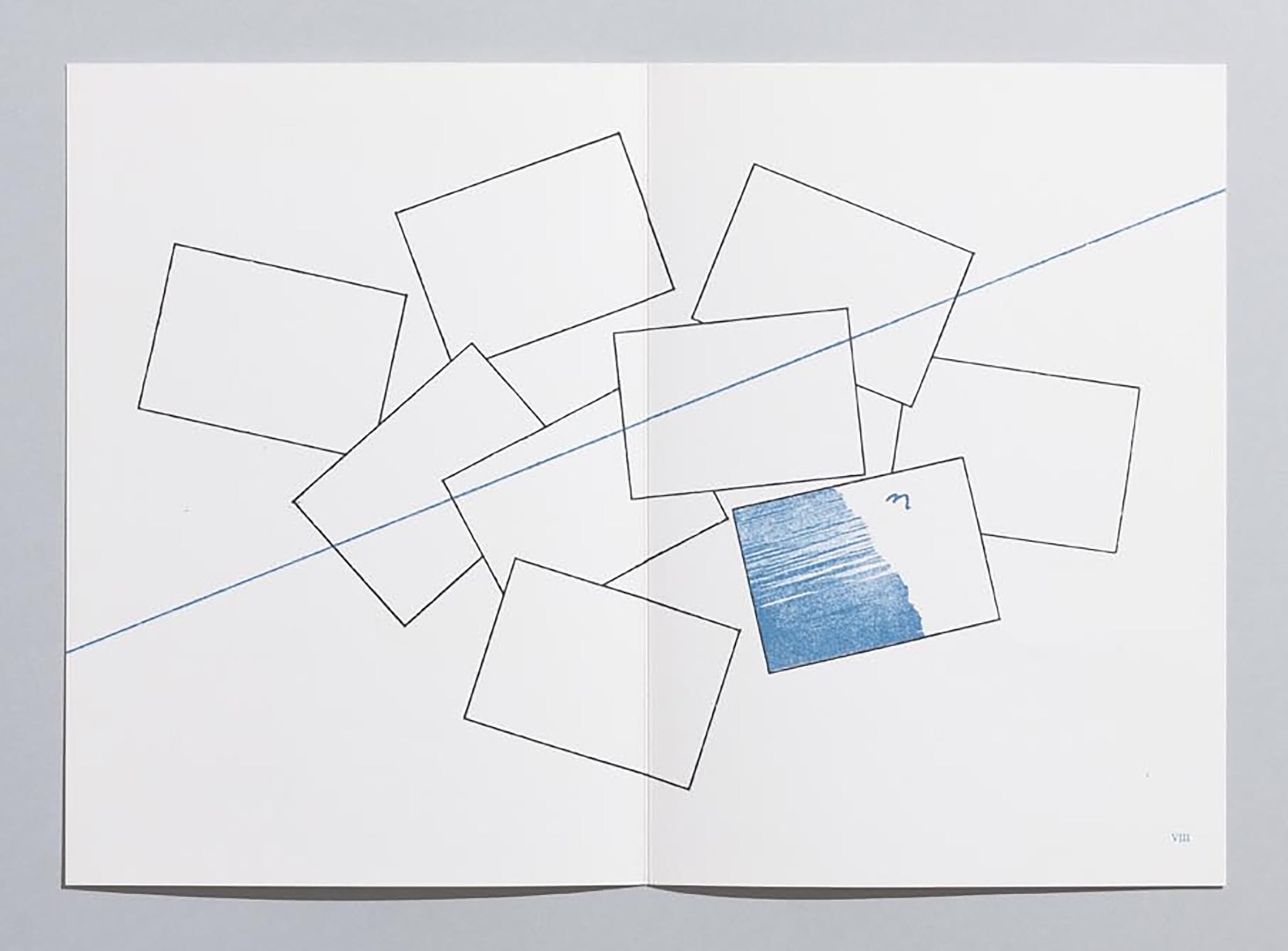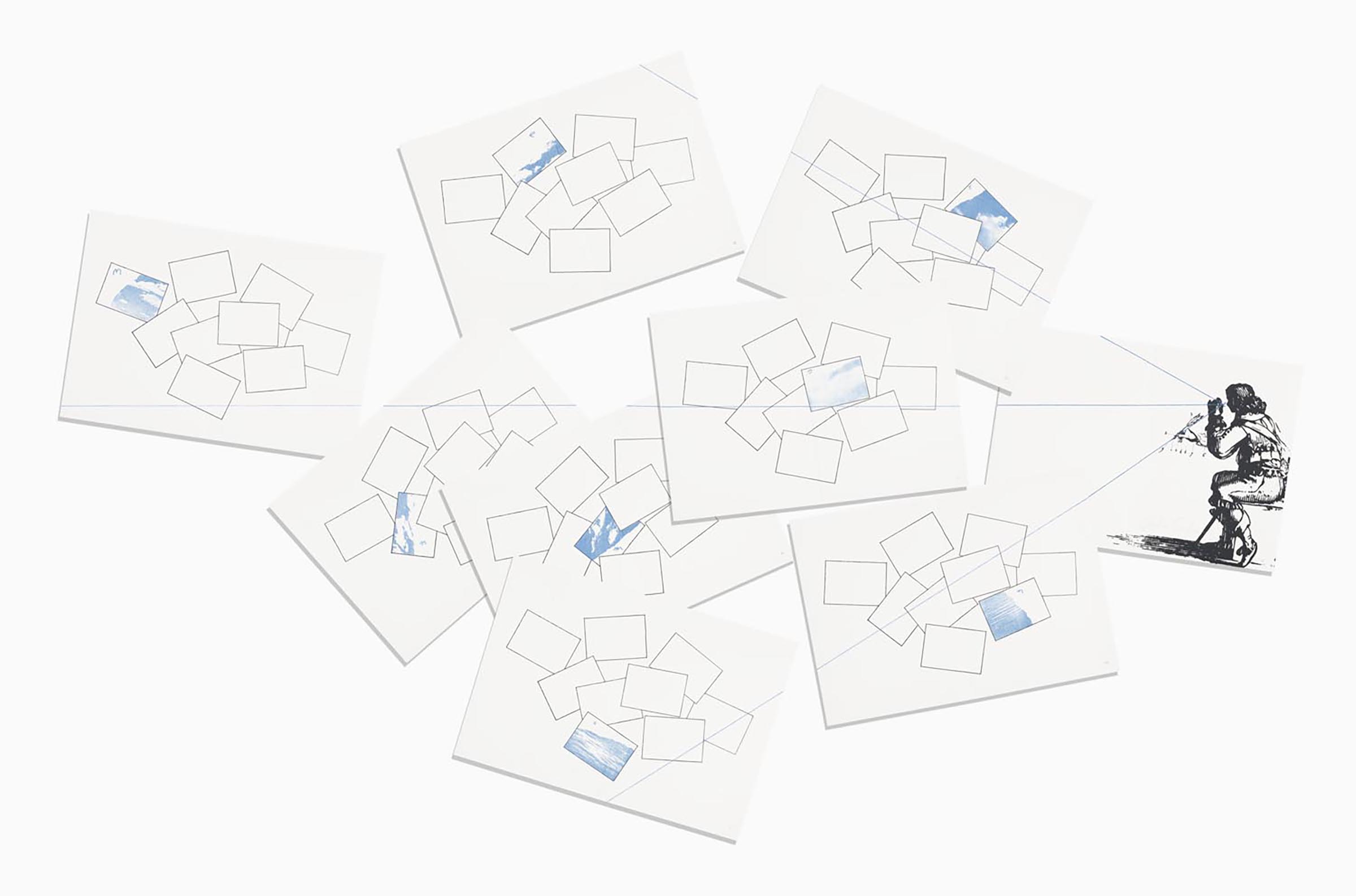 The first eight plates represent a drawing featuring nine rectangles corresponding to the ensemble of plates included in the multiple itself. Each time, the rectangle that coincides with the plate in question contains a photographic fragment of the sky or the sea. Each of the plates also features a letter written in blue and in autograph calligraphy so as to compose, in the numbered sequence of plates, the name of the Greek goddess Mnemosyne. The ninth plate instead reproduces a male figure (taken from a seventeenth-century handbook about perspective), intent on observing and drawing, as indicated respectively by the blue lines that start from the eye and the image of a hand holding a pen.1 In the installed multiple, the figure is at the far right end, so that all the plates, open and arranged like in the drawing they reproduce, are inscribed in its field of vision, indicated by the extension of the visual rays from the eye in the individual plates.